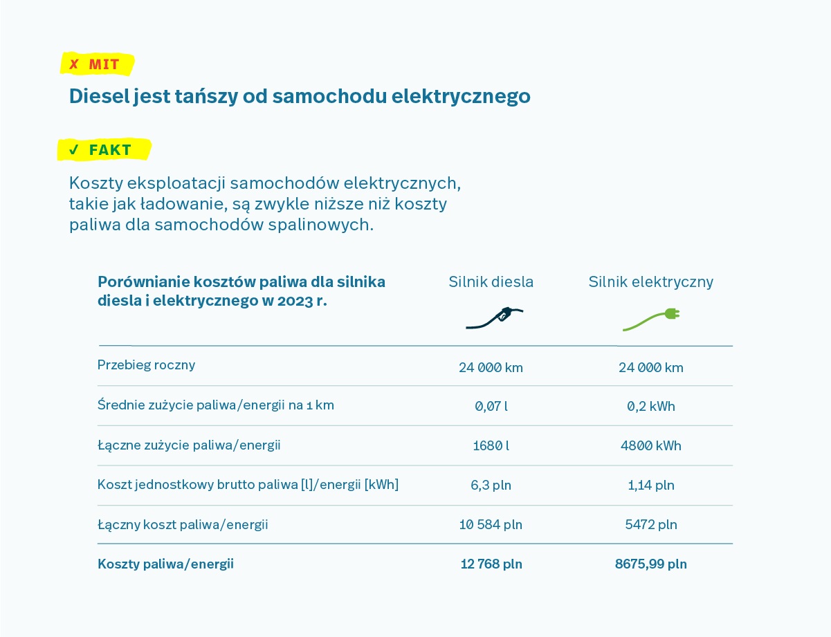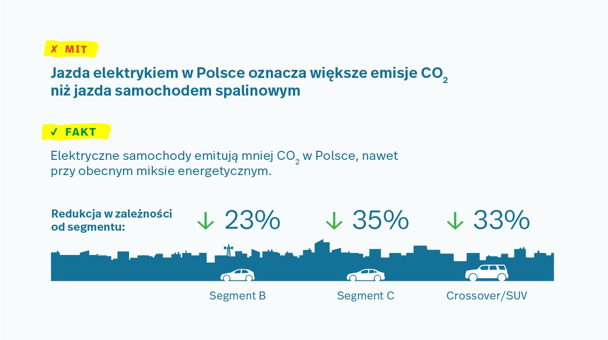 „Elektryk jest gorszy dla środowiska od samochodu spalinowego” - to jeden z najbardziej rozpowszechnionych mitów. W Polsce większość energii nadal produkujemy w oparciu o węgiel, dlatego wiele osób twierdzi, że jazda na prąd wygeneruje większy ślad węglowy (emisje CO2). Prawda jest inna, dzisiaj auto elektryczne w Polsce generuje nawet o 1/3 mniej CO2 w trakcie eksploatacji od auta spalinowego, jest też lepszy dla klimatu także od hybryd. Ale kluczowe jest zbadanie całego cyklu życia - a więc emisji związanych z produkcją, użytkowaniem oraz utylizacją. Przy założeniu, że samochód elektryczny i spalinowy jest eksploatowany przez 15 lat (to średnia wieku aut w Polsce) i przejeżdża w tym czasie 150 tys. km, to emisje CO2 z samochodu elektrycznego eksploatowanego nawet w Polsce są znacznie mniejsze od samochodu spalinowego.