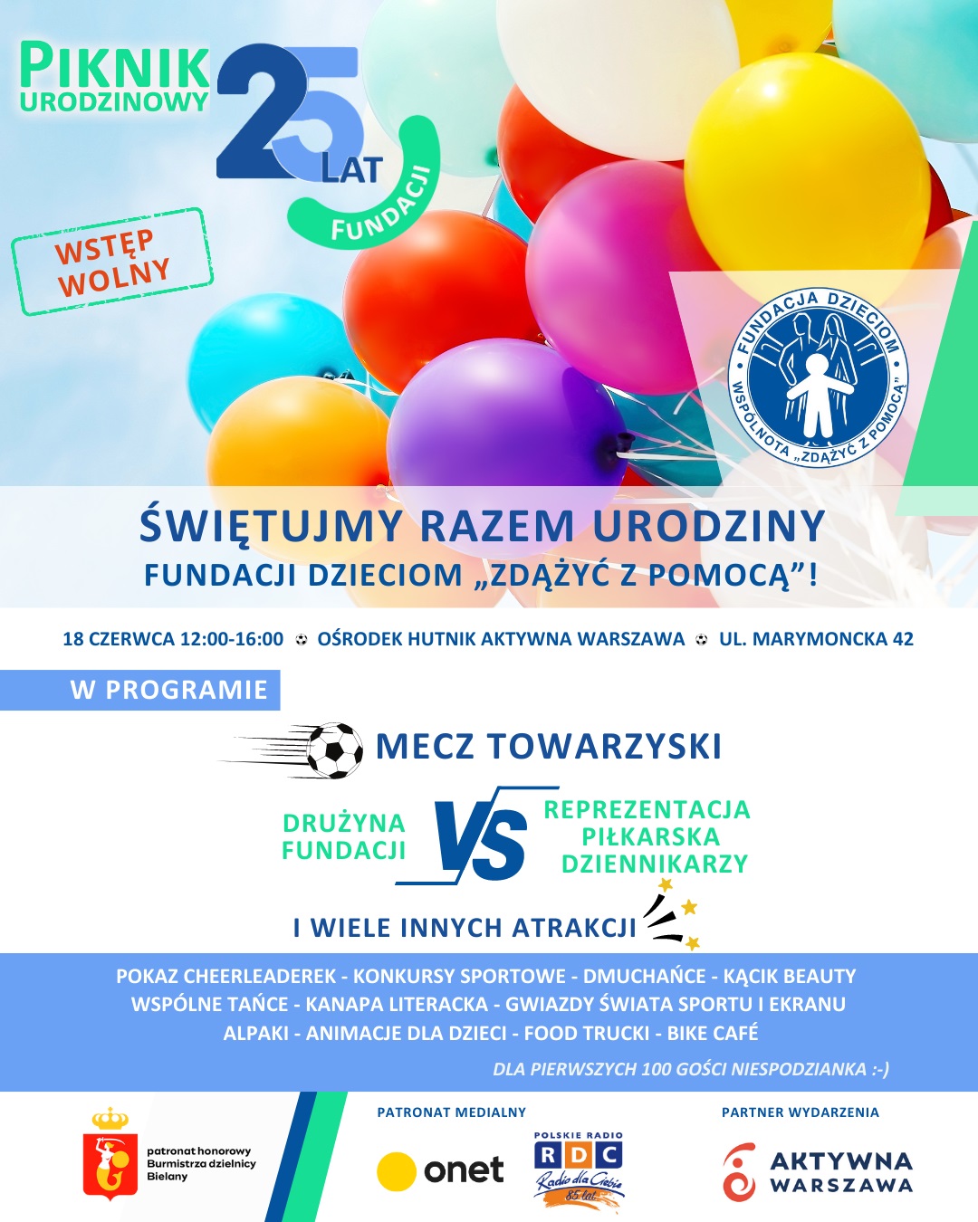Z okazji 25-lecia istnienia Fundacja Dzieciom „Zdążyć z Pomocą” zaprasza na piknik rodzinny, który odbędzie się 18 czerwca w Ośrodku Hutnik Aktywnej Warszawy przy ulicy Marymonckiej 42. Główną atrakcją będzie mecz piłkarski, który zostanie rozegrany pomiędzy Piłkarską Reprezentacją Dziennikarzy i zespołem złożonym z rodzin podopiecznych, pracowników Fundacji i jej przyjaciół. Sędzią tego wyjątkowego meczu będzie Tomasz Listkiewicz. Swoje komentatorskie umiejętności zaprezentuje duet Michał Zawacki i Andrzej Strejlau.