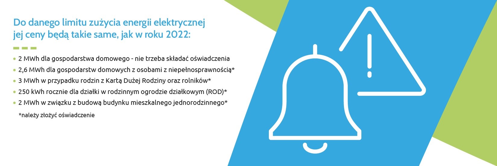 W 2023 roku każde gospodarstwo domowe w Polsce korzysta z zamrożenia cen energii elektrycznej na poziomie cen z 2022 roku. Wszystkie gospodarstwa domowe, bez żadnych formalności mają zamrożone stawki do progu zużycia 2 000 kWh energii. Jeżeli jednak w danym gospodarstwie jest osoba z niepełnosprawnością, wówczas limit zużycia jest wyższy i wynosi 2 600 kWh. W przypadku rolników oraz posiadaczy Karty Dużej Rodziny, limit ten to 3 000 kWh. W takich sytuacjach, zgodnie z obowiązującym prawem, wymagane jest złożenie do końca czerwca 2023 roku oświadczenia potwierdzającego prawo do zwiększonego limitu.