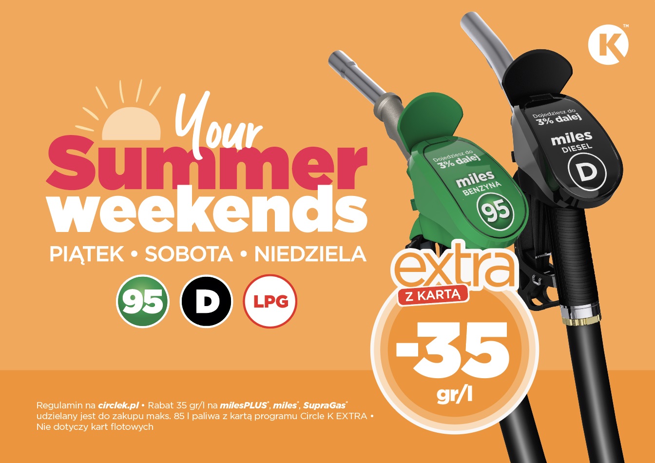 Wraz z rozpoczynającym się okresem wakacyjnym Circle K zaoferuje swoim klientom wyjątkowe zniżki na paliwo. Już 23 czerwca w godzinach od 14:00 do 17:00, w ramach akcji "Summer Day”, klienci będą mogli skorzystać z rabatu 50 gr/l na paliwa miles® oraz milesPLUS®. W kolejnych dniach zostanie uruchomiona akcja wakacyjna „Summer Weekends”, dzięki której pojawią się na stacjach kolejne rabaty, umożliwiające zakup wszystkich rodzajów paliw w niższych cenach. Z oferty będą mogli skorzystać posiadacze karty lojalnościowej EXTRA.