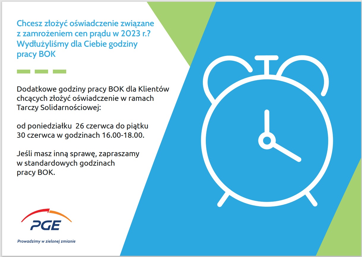 PGE wydłużyła godziny pracy stacjonarnych Biur Obsługi Klienta. Od 26 do 30 czerwca br. będą one otwarte od 8:00 do 18:00, przy czym w godz. od 16:00 do 18:00 przyjmowane będą tylko oświadczenia w zakresie Tarczy Solidarnościowej. W ten sposób PGE wychodzi naprzeciw oczekiwaniom klientów, którym przysługują zwiększone limity zużycia energii przy zamrożonych cenach, a jeszcze nie złożyli koniecznych dokumentów. Oświadczenia należy złożyć do końca czerwca br.