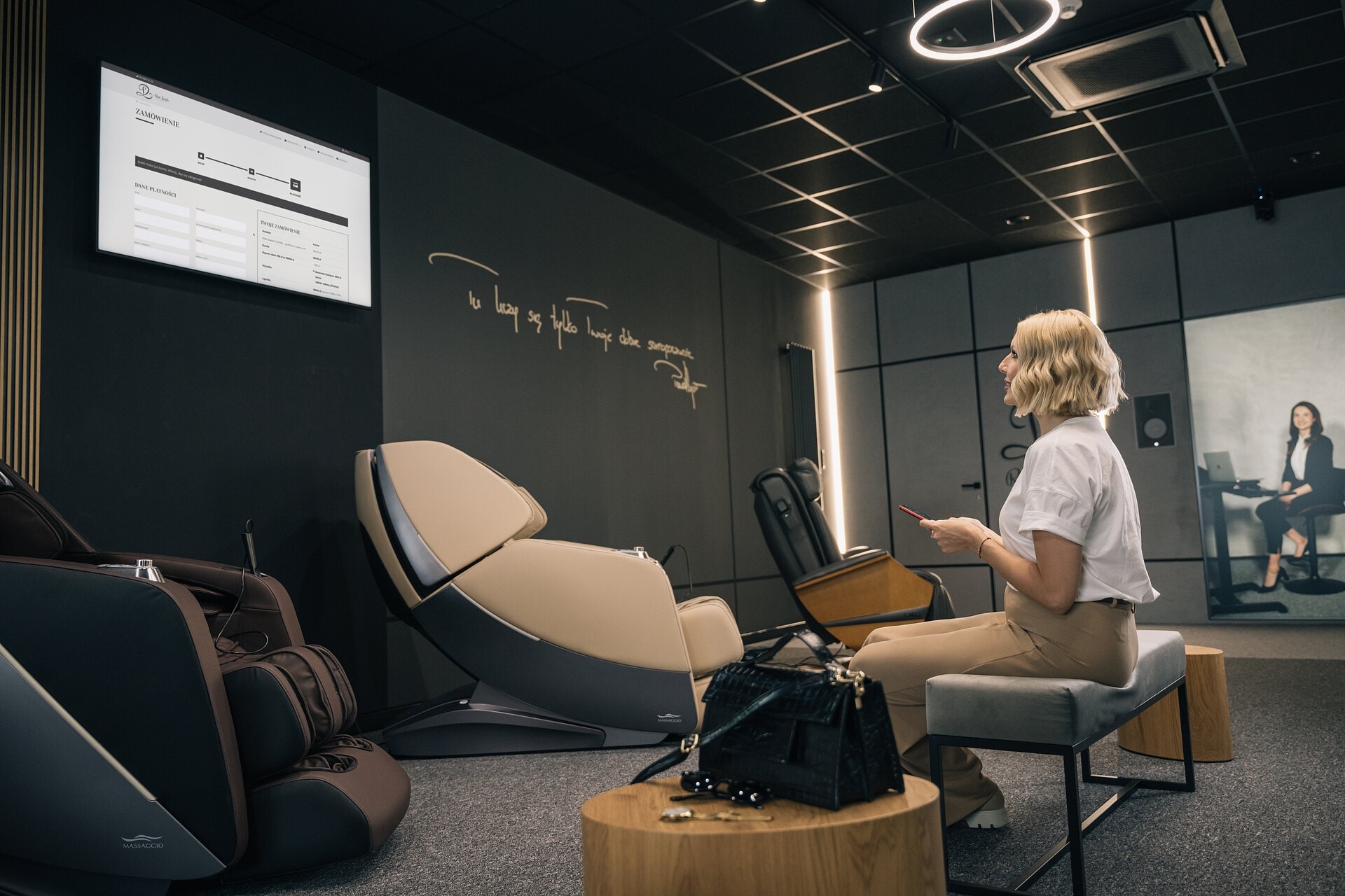 W pionierskim R-ShowRoom’ie, klient ma możliwość przetestowania wszystkich foteli masujących z oferty, w realnym salonie przy zdalnej asyście eksperta, który może czynnie uczestniczyć w wizycie z dowolnego miejsca na świecie. Komunikacja przebiega naturalnie, w czasie rzeczywistym. Doradca ma pełny wgląd i kontrolę nad salonem wystawowym. Całość systemu jest skonfigurowana z wykorzystaniem aktualnie najbardziej zaawansowanych technologii audiowizualnych, internetowych, komunikacyjnych, czy zdalnego dostępu. Stworzenie go było możliwe, dzięki ogromnemu rozwojowi technologii pracy zdalnej, jaki dokonał się szczególnie intensywnie po 2020 r.