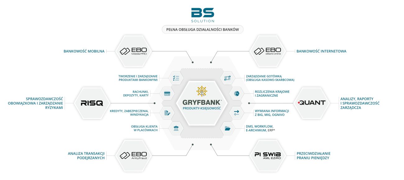 Centralnym elementem tego rozwiązania jest system produktowo-księgowy GRYFBANK autorstwa HEUTHES sp. z o.o., agregujący dane i integrujący je z nowoczesnymi kanałami dystrybucji, takimi jak bankowość internetowa EBO eBank Online oraz bankowość mobilna EBO Mobile PRO autorstwa I-BS.pl sp. z o.o. Zgromadzone dane o klientach i transakcjach stanowią źródło dla generowanej w zautomatyzowany sposób sprawozdawczości obowiązkowej oraz dla zarządzania ryzykami w module RISQ i szeroko pojętej sprawozdawczości zarządczej ‒ QUANT.