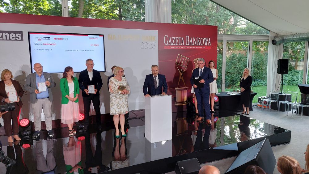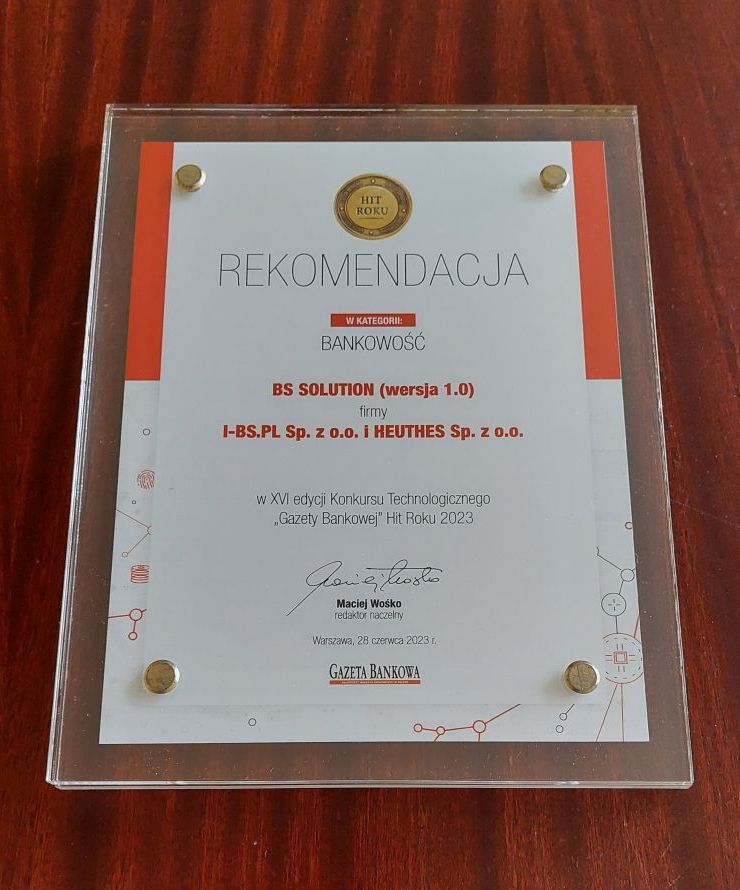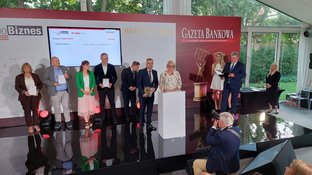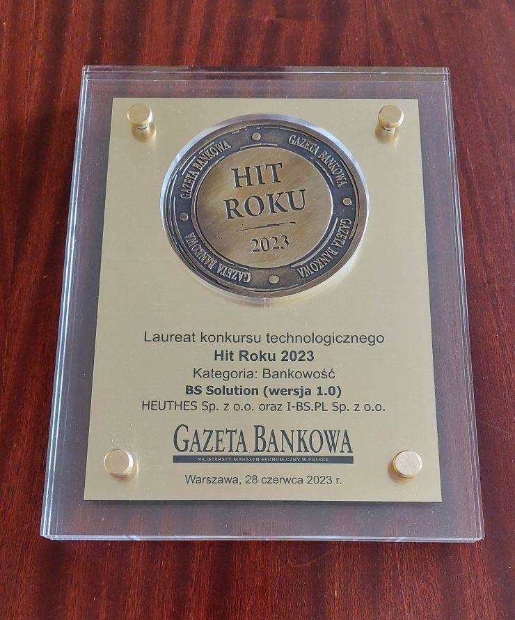 W trakcie Gali rozstrzygnięto wyniki prestiżowego konkursu Hit Roku. Konsorcjum firm I-BS.pl sp. z o.o. i HEUTHES sp. z o.o. otrzymało nagrodę główną Hit Roku 2023 w kategorii Bankowość oraz Rekomendację w tym samym konkursie za system BS Solution.