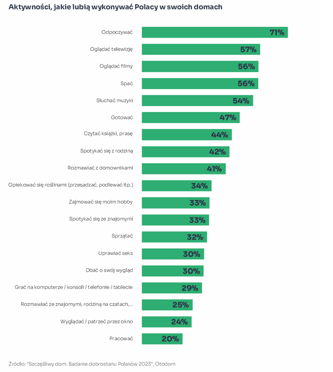 Z raportu Otodom wynika, że ci, którzy deklarują najwyższy poziom dobrostanu istotnie częściej niż nieszczęśliwi lubią w swoich domach ćwiczyć, gimnastykować się, zajmować się hobby, oglądać filmy, słuchać muzyki, czytać książki lub prasę, spotykać się ze znajomymi i z rodziną, grać w planszówki, rozmawiać z domownikami, opiekować się dziećmi i bawić się z nimi, ale także uczyć się, pracować, sprzątać, a nawet prasować. Przodownicy szczęścia bardziej niż nieszczęśliwi lubią także dbać o swój wygląd, uprawiać seks, rozmawiać ze znajomymi poprzez komunikatory, opiekować się roślinami i zwyczajnie odpoczywać.