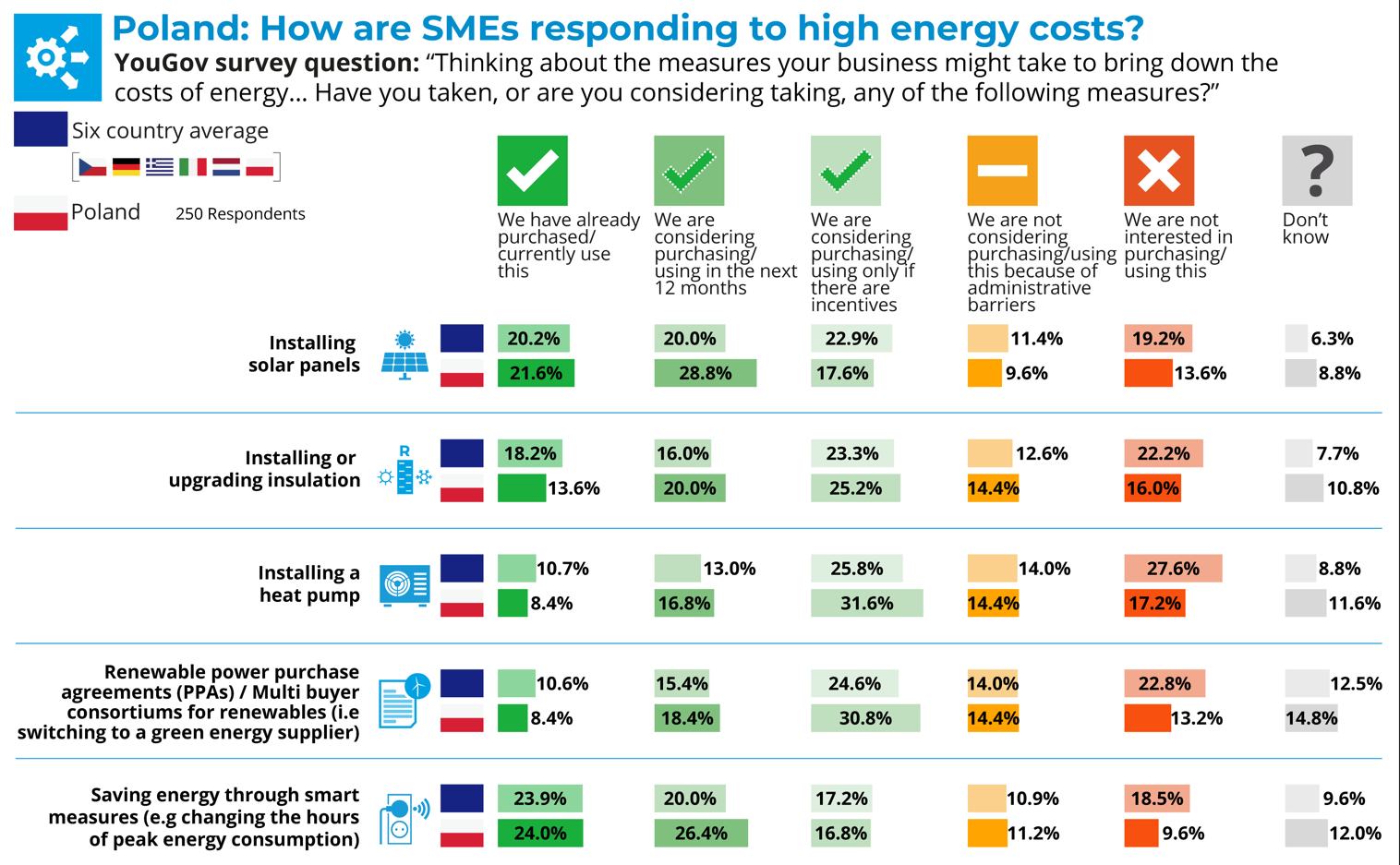 Ponad dwie trzecie polskich MŚP uważa, że wysokie koszty energii czynią ich biznes mniej rentownym (68%) i wini te koszty za podwyżki cen swoich towarów i usług (71%). Prawie połowa tłumaczy też, że ze względu na wysokie koszty energii musiała zredukować zatrudnienie; to znacznie powyżej średniej (wynoszącej 33%) w UE.