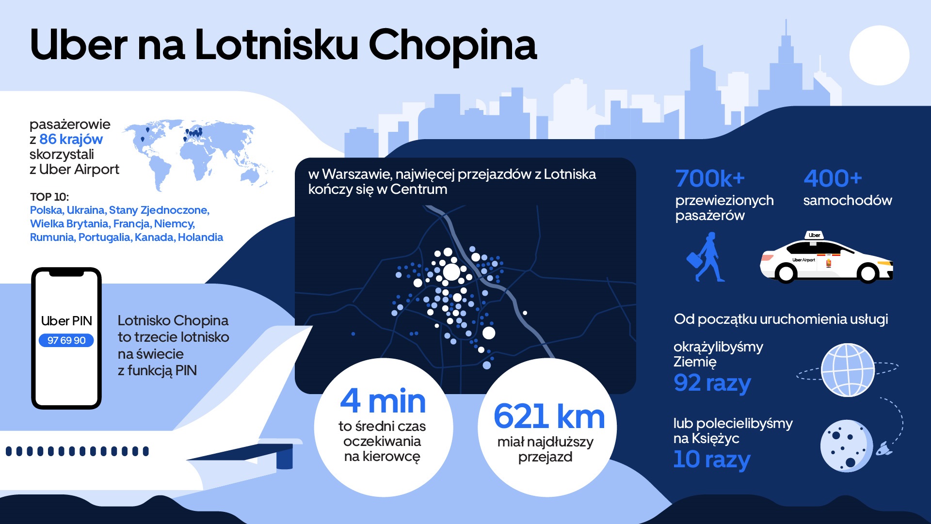 Uber i Lotnisko Chopina świętują pierwszy rok współpracy. Z tej okazji Uber uruchomił innowacyjną funkcję zamawiania przejazdu z wykorzystaniem PINu, dzięki czemu Lotnisko Chopina jest trzecim na świecie portem lotniczym, z którego pasażerowie mogą zamawiać taksówki w ten sposób. W ciągu pierwszego roku współpracy z usługi Uber Airport skorzystało ponad 700 tysięcy pasażerów, pochodzących z 86 krajów.