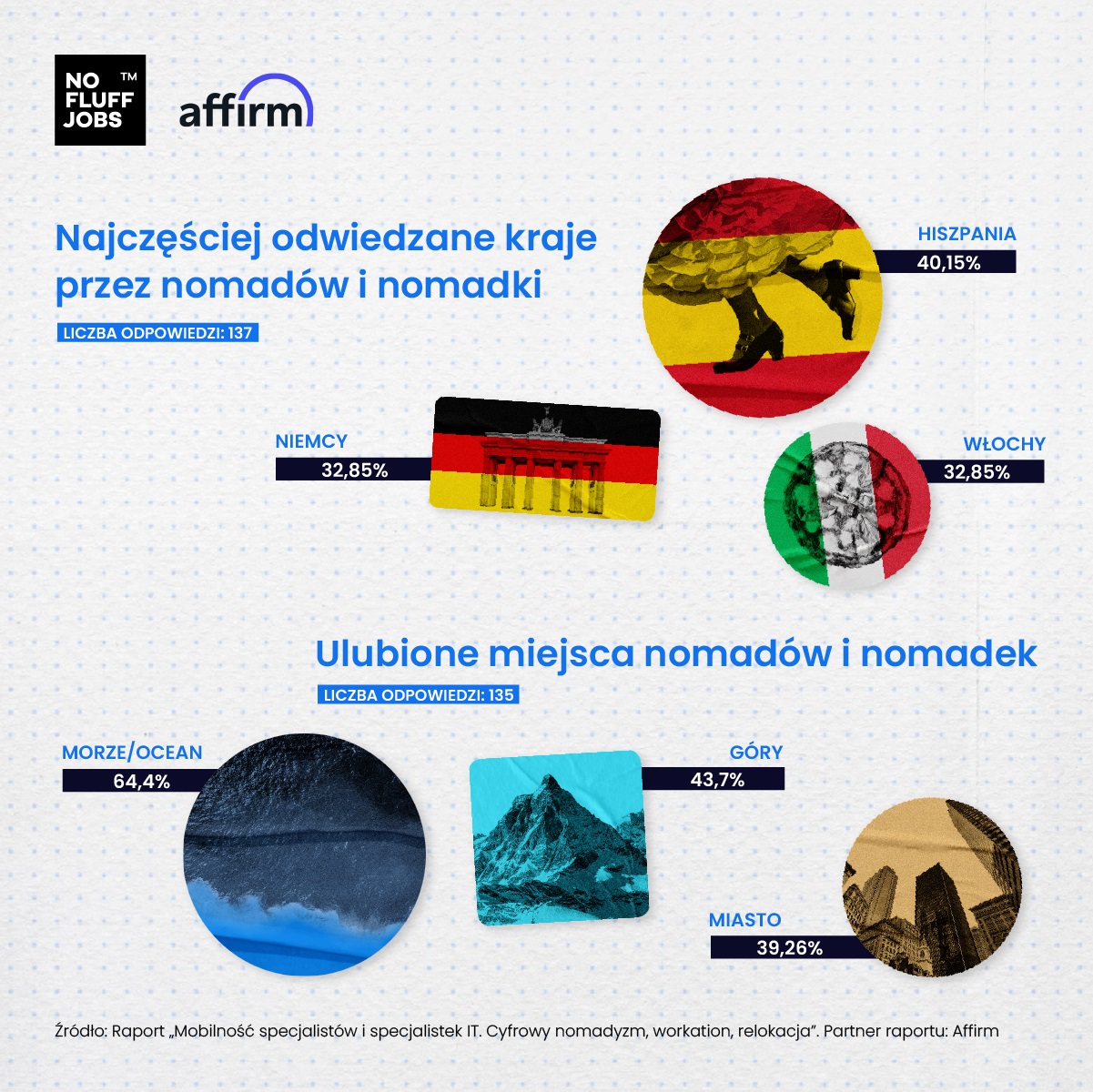 Spośród cyfrowych nomadów i nomadek większość pełni funkcje seniorów (34,43 proc.) lub midów (33,27 proc.) i ma doświadczenie zawodowe powyżej ośmiu lat (35,98 proc.) albo od dwóch do pięciu lat (24,56 proc.). Większość z nich w ciągu ostatniego roku pracowała z dwóch lub trzech krajów. Najczęściej wybieranym kierunkiem jest Hiszpania, którą wskazało 40,15 proc. respondentów i respondentek. Kolejne miejsce zajęły Niemcy i Włochy, uzyskując po 32,85 proc. odpowiedzi. Jako swoje ulubione miejsca 64,4 proc. badanych z tej grupy wskazuje morze lub ocean, 43,7 proc. góry, a 39,26 proc. miasto.