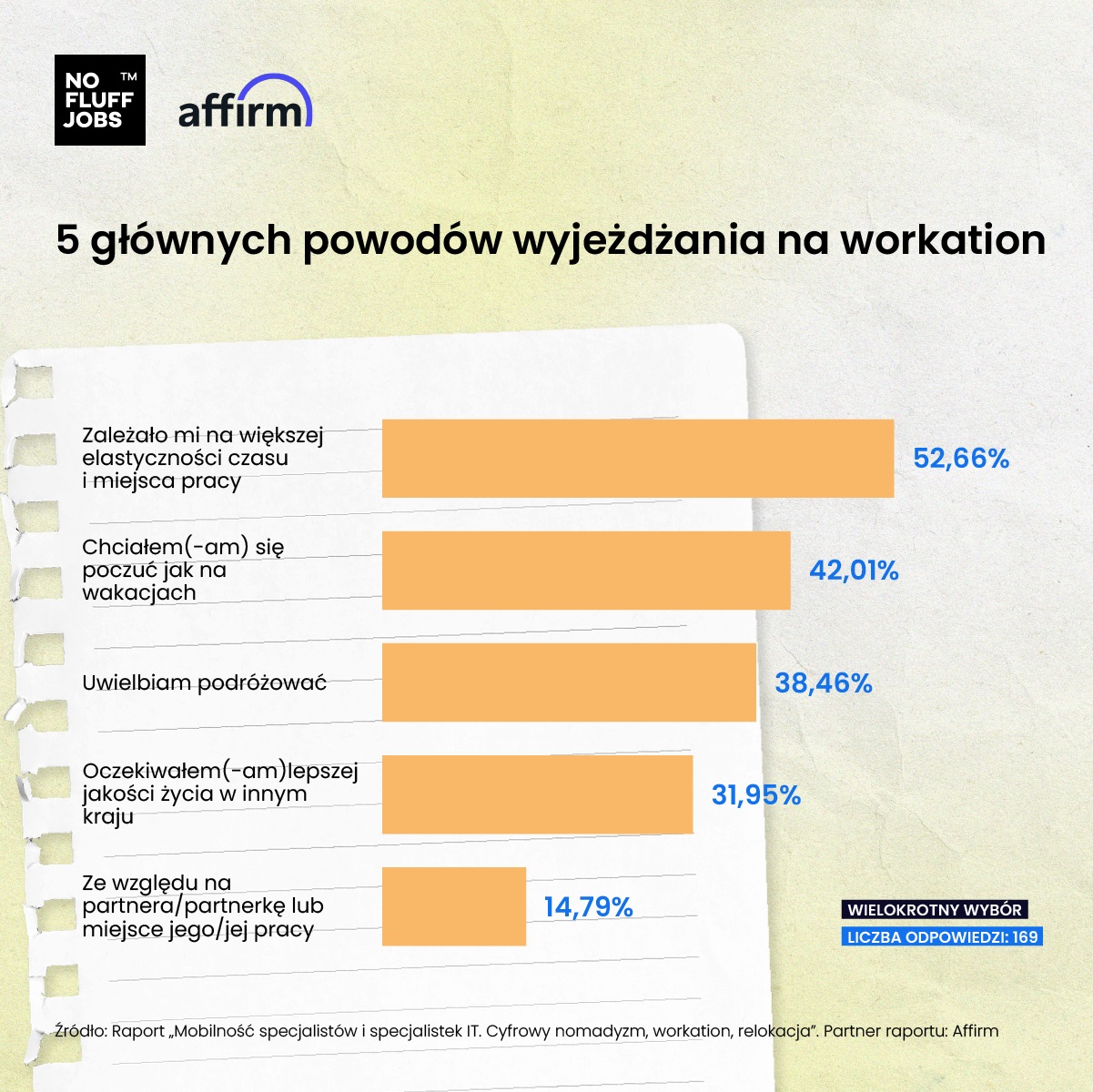 Ponad 68 proc. cyfrowych nomadów i nomadek wybrało taki styl życia z powodu zamiłowania do podróży, a 55 proc. czuje, że w ten sposób zaspokaja potrzebę większej elastyczności czasu i miejsca pracy. Niecałe 34 proc. wskazało dwa powody - oczekiwanie lepszej jakości życia poza dotychczasowym miejscem zamieszkania oraz osiągnięcie „urlopu bez urlopu”.