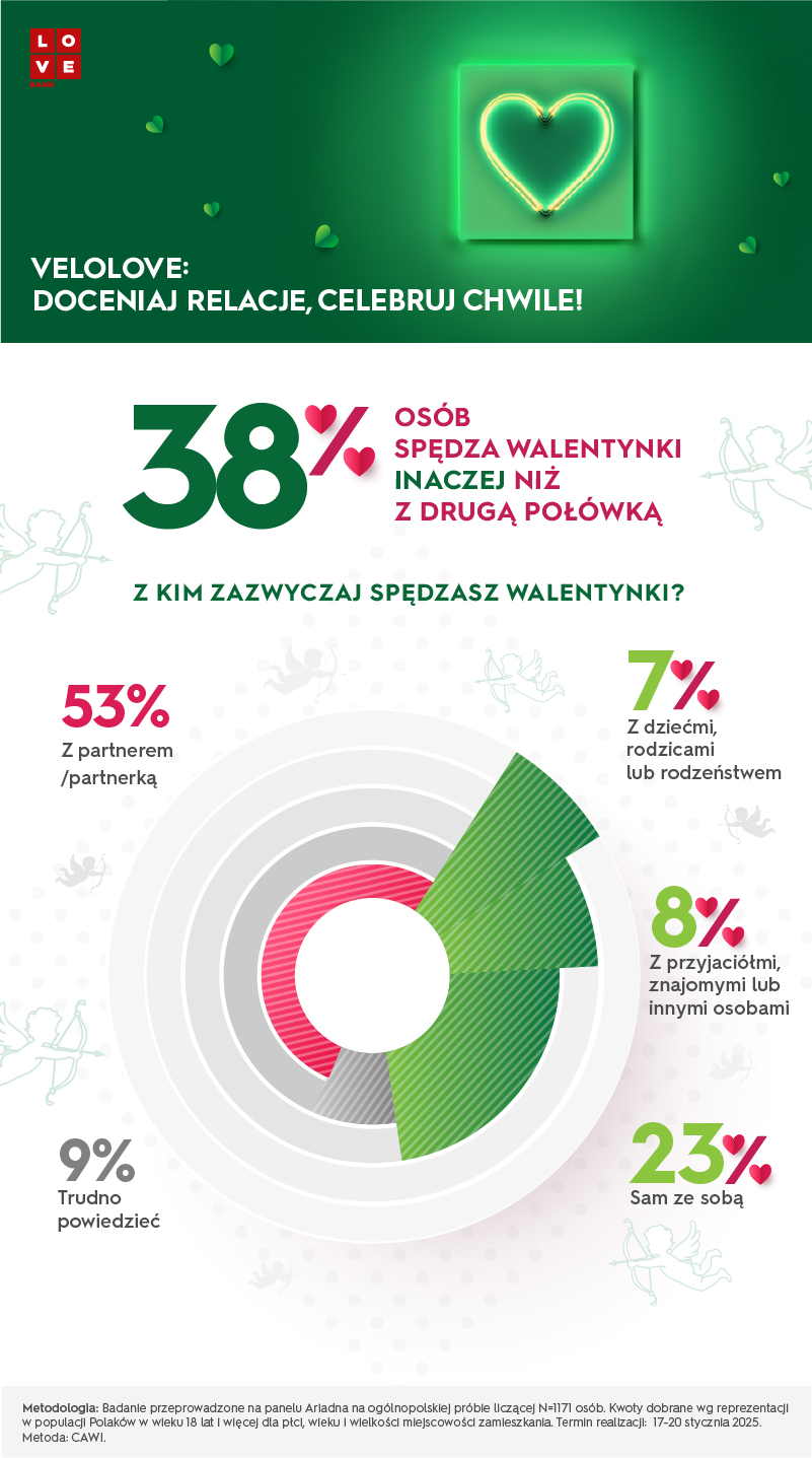 „Wzrost o 5 punktów procentowych rok do roku pokazuje, że rośnie grono osób, które wierzą, że 14 lutego to nie tylko czas dla zakochanych, ale święto doceniania bliskich i samego siebie. Tym samym maleje liczba tych, którzy tego dnia czują się zagubieni. My w VeloBanku bardzo w tę koncepcję wierzymy, dlatego obchodzimy walentynki z hasłem VeloLove: doceniaj relacje, celebruj chwile. Tak robią Polacy, a my od początku istnienia VeloBanku wspieramy życie na własnych zasadach. Dziś już niemal 40 procent osób deklaruje, że walentynki spędzi inaczej niż w parze, a my kibicujemy wszystkim, którzy kochają i doceniają - nie tylko partnera, ale także rodzinę, przyjaciół, życie, a przede wszystkim siebie” - wskazuje Katarzyna Meissner, dyrektor zarządzająca obszarem komunikacji i marketingu w VeloBanku.