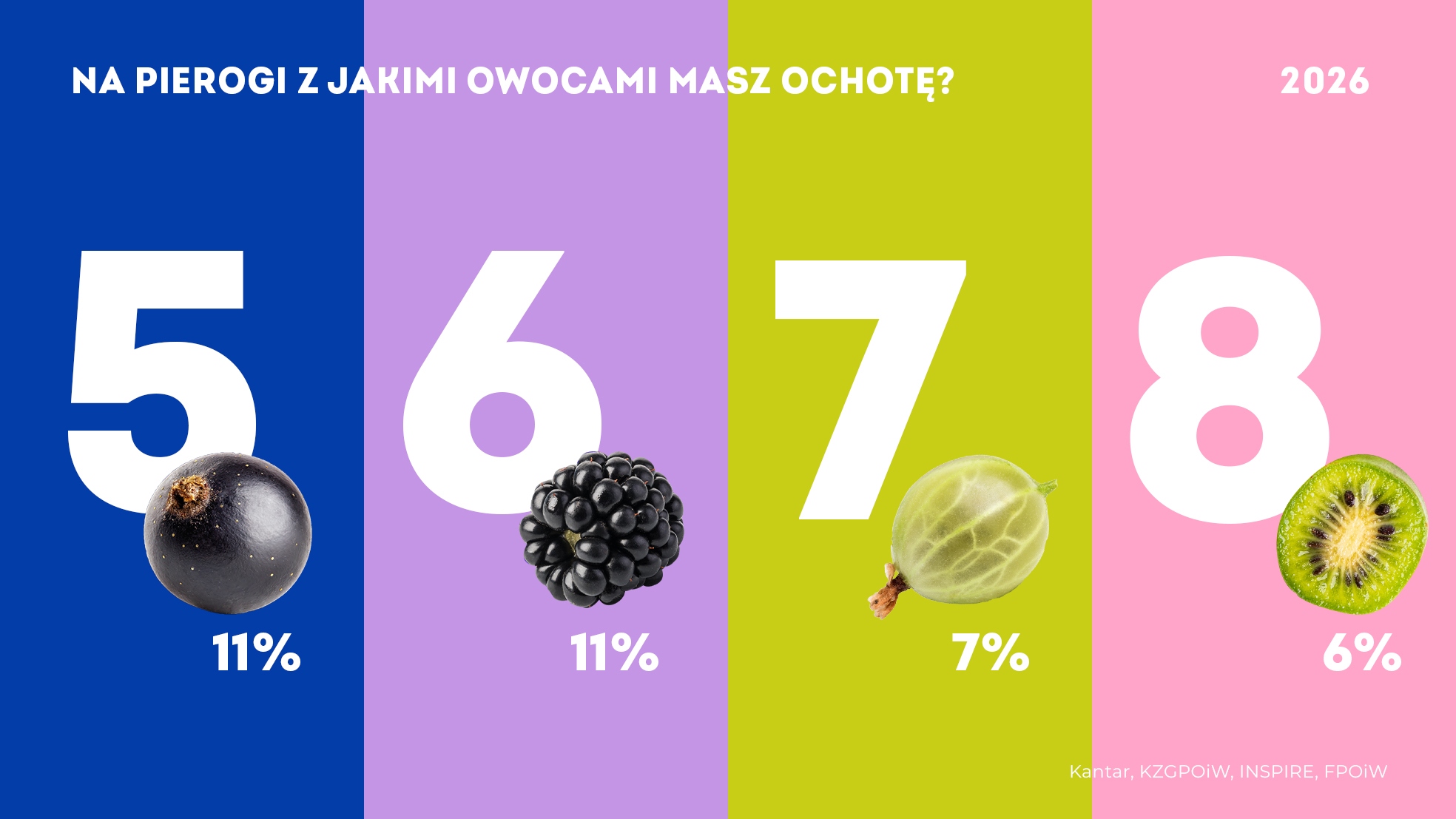 Bardzo wysokie okazują się deklaracje konsumpcji pierogów z jagodą kamczacką (21%). Wielu sympatyków mają także pierogi z porzeczkami i jeżynami (po 11%). Na kolejnych miejscach listy życzeń znalazły się pierogi z agrestem (7%), minikiwi (6%) i z aronią (5%).