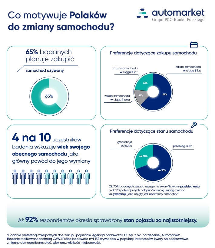 Badania przeprowadzone na zlecenie Automarket.pl, należącej do PKO Leasing platformy oferującej finansowanie samochodów nowych i używanych, wskazują, że aż 62% dorosłych Polaków planuje zakup samochodu w ciągu najbliższych 5 lat. Blisko dwie trzecie z nich zamierza kupić samochód używany (65%), ale młodszy niż posiadany obecnie. Dla 43% badanych głównym powodem kupna auta będzie właśnie wiek obecnie posiadanego pojazdu.