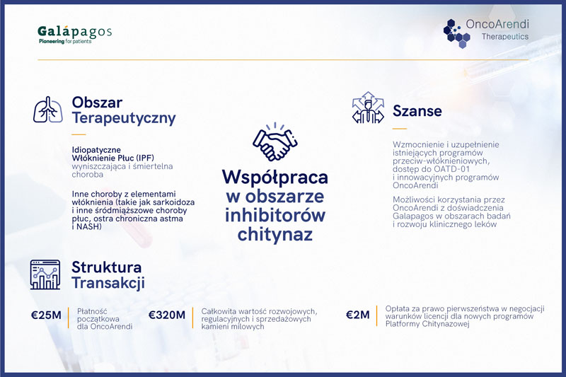 Polska spółka biotechnologiczna OncoArendi Therapeutics S.A. podpisała umowę partneringową z największą europejską spółką biotechnologiczną Galapagos NV. Umowa zakłada rozwój innowacyjnego leku opartego o cząsteczkę OATD-01 lub inne podwójne inhibitory chitynaz do zastosowania w terapii idiopatycznego włóknienia płuc (IPF) lub innych wskazaniach. Wartość kontraktu (322 mln euro) - to rekord w dotychczasowej historii polskiej biotechnologii.