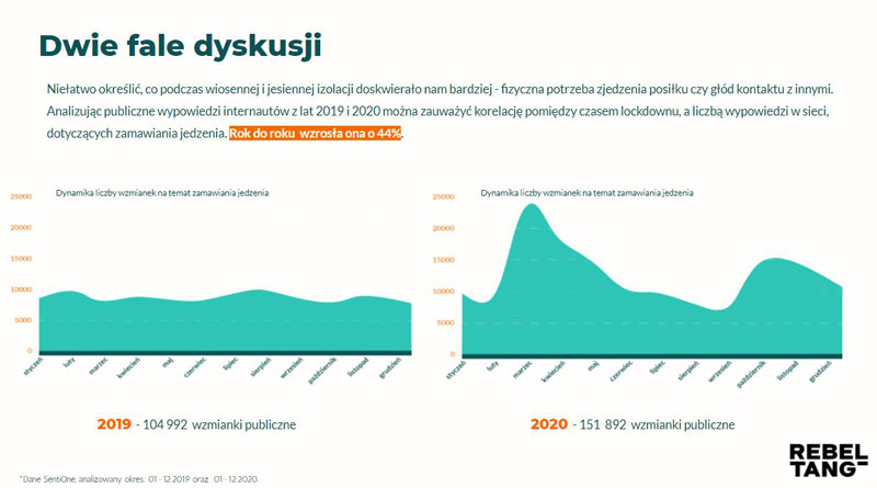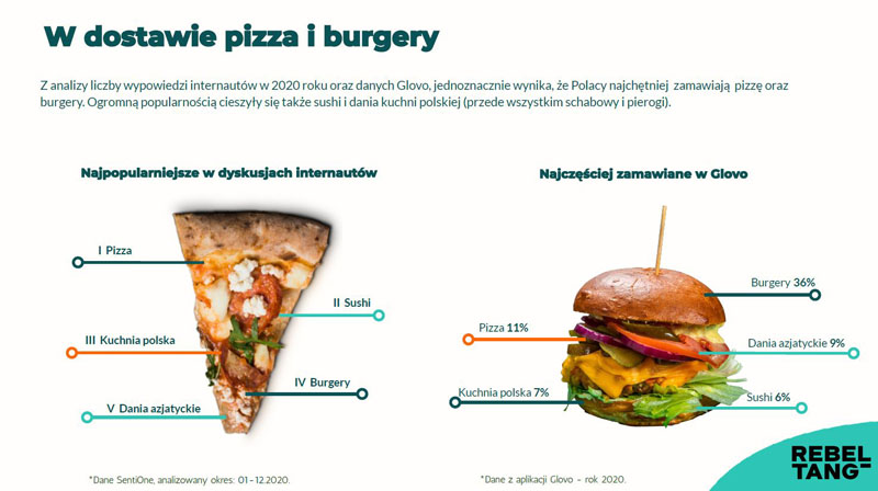 Internet to najlepszy barometr nastrojów społecznych, wobec czego za pośrednictwem narzędzi analitycznych, badających wypowiedzi i wyszukiwania internautów (takich jak SentiOne czy Google Trends), firma Rebel Tang przeanalizowała rynek dostaw restauracyjnych w percepcji użytkowników sieci. Raport uzupełniło badanie własne - 82% ankietowanych zadeklarowało, że w 2020 r. chociaż raz zdecydowało się na zamówienie dań z restauracji w której dotychczas nie jedli. Pandemia skłoniła Polaków do sięgania po dostawę - 67% ankietowanych przyznało, że korzystało z tej opcji częściej niż w 2020. Z danych Glovo wynika, że najchętniej zamawianymi daniami były pizza i burgery.