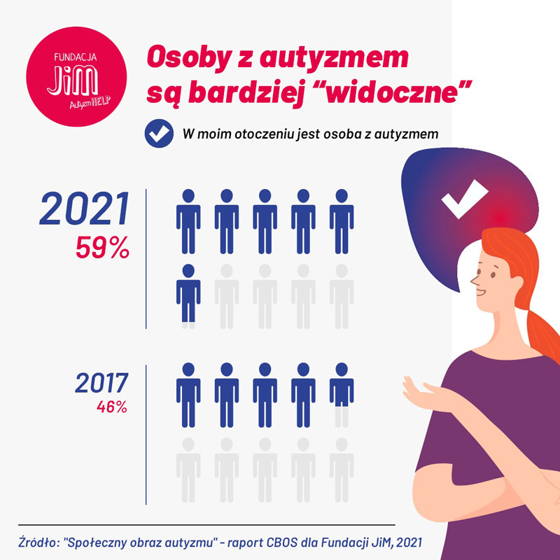 Osoby autystyczne są coraz bardziej „widoczne”. W porównaniu z wynikami badania z roku 2017, wzrósł odsetek deklaracji kontaktu z osobą z autyzmem lub jej historią - wskazania wynoszą w sumie 59 proc. „Relatywnie wielu badanych deklaruje kontakt z osobą z autyzmem na polu zawodowym [1]”.