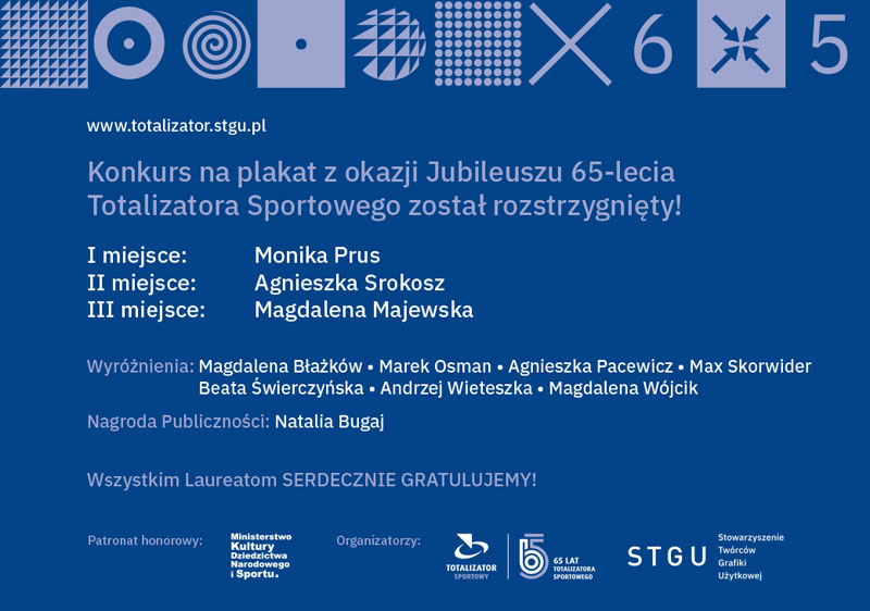 632 prace nadesłane przez ponad 350 uczestników zakwalifikowały się do konkursu na plakat z okazji Jubileuszu 65-lecia Totalizatora Sportowego. Nabór zakończył się 5 kwietnia. Wczoraj zostały ogłoszone wyniki. Konkurs został przeprowadzony przy udziale Stowarzyszenia Twórców Grafiki Użytkowej. Patronat honorowy nad wydarzeniem objęło Ministerstwo Kultury, Dziedzictwa Narodowego i Sportu.