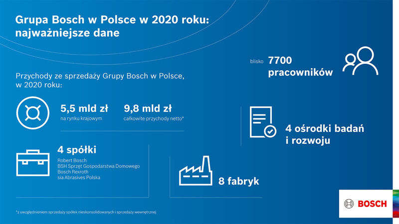 Skonsolidowane przychody ze sprzedaży na rynku krajowym Grupy Bosch w Polsce wyniosły w 2020 roku blisko 5,5 mld zł, a przychody całkowite netto wzrosły do blisko 9,8 mld zł. Bosch intensywnie rozbudowuje Centrum Kompetencji IT w Polsce, a transformację w kierunku zielonych technologii postrzega jako szansę na dalszy rozwój wielu obszarów swojego biznesu.