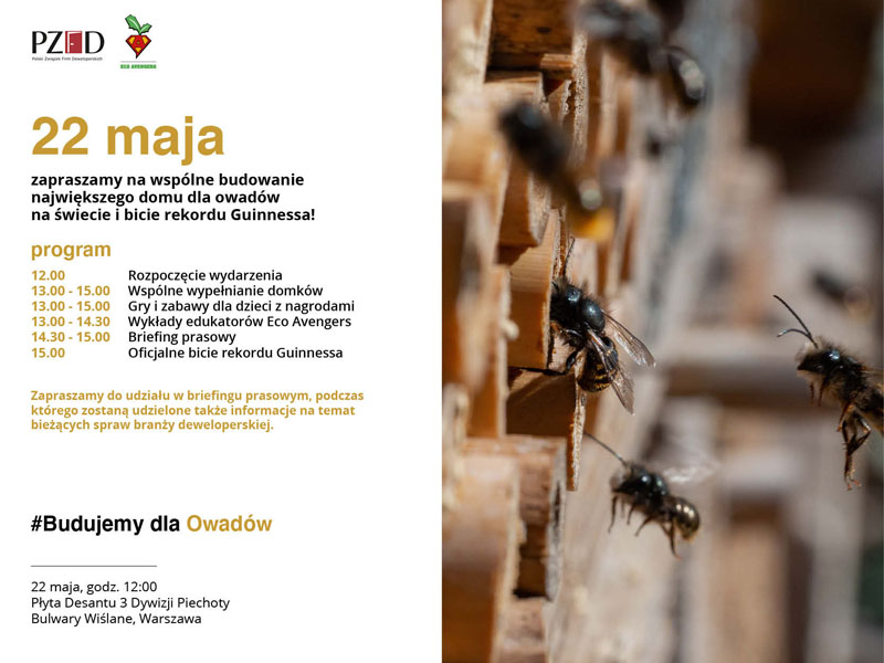 Powiedzieć o planowanym domu dla owadów, że to przysłowiowe „cztery kąty” to zdecydowanie za mało. Przedsiębiorcy zrzeszeni w Polskim Związku Firm Deweloperskich chcą zapisać się na kartach historii jako twórcy największego siedliska dla owadów na świecie. Wspólnie podejmą próbę pobicia rekordu Guinnessa, której finał będzie można zobaczyć już 22 maja na Płycie Desantu 3. Dywizji Piechoty w Warszawie.