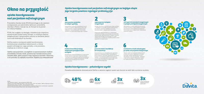 DaVita rekomenduje wprowadzenie w Polsce modelu opieki koordynowanej, w którym potrzeby pacjenta w zaawansowanym stadium PChN mogą być w pełni realizowane w stacjach dializ i kooperujących poradniach nefrologicznych. Tam pacjenci spędzają najwięcej czasu, mają najszerszy kontakt z lekarzem, a lekarz najlepiej wie, czego jego pacjenci potrzebują, szczególnie gdy choroba ma zaawansowaną postać.