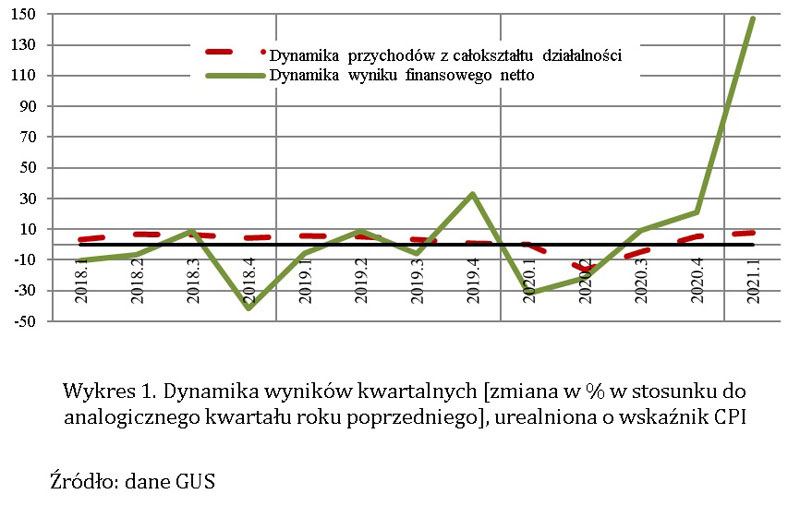 Oczekiwana po tąpnięciu wywołanym pandemią poprawa wyników przedsiębiorstw niefinansowych, widoczna już w 4. kw. 2020 r., w kolejnym kwartale jest jeszcze wyraźniejsza. Wprawdzie przychody z całokształtu działalności były w 1. kw. 2021 r. nieco niższe niż w ostatnim kwartale 2020 r., ale i tak był to poziom bardzo wysoki - wyższy niż we wcześniejszych kwartałach, a także o 10,4% nominalnie (a o 7,5% realnie) wyższy od analogicznych przychodów w 1. kw. 2020 r. Tak wysokiej dynamiki przychodów nie odnotowano od 4 lat.