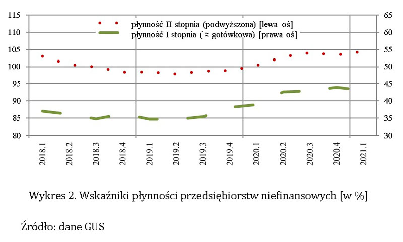 Cykle obrotu zapasów i należności, które uległy ponadprzeciętnemu wydłużeniu w 2. kw. 2020 r. i równie nietypowemu skróceniu w 4. kw. 2020 r., wydają się wracać do normy - w 1. kw. 2021 r. wydłużyły się do, odpowiednio, 42 i 35 dni, co stanowi wartości zbliżone do średnich z ostatnich lat. Płynność przedsiębiorstw nadal jest relatywnie wysoka (wyraźnie wyższa niż w latach przed pandemią). W stosunku do 4. kw. 2020 r. wskaźniki uległy zmianie o 1 p.p.; płynność II stopnia (podwyższona) wzrosła do 104,4%, a płynność pierwszego stopnia (≈gotówkowa) spadła do 43,0%. Jedną z istotnych przyczyn dobrej płynności jest zapewne wstrzymywanie nakładów inwestycyjnych, ale politykę przedsiębiorstw w tym zakresie w 1. kw. 2021 r. trudno ocenić ze względu na brak informacji (dane o inwestycjach pojawiają się później niż inne).