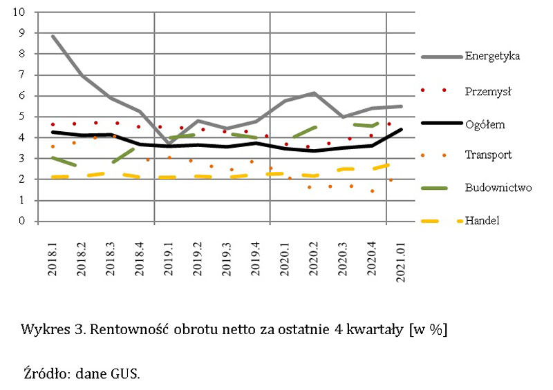 Spośród pięciu głównych branż gospodarki energetyka wykazała w 1. kw. 2021 r. najskromniejszą dynamikę przychodów i zysku (wzrosty w stosunku do 1. kw. 2020 r. wyniosły odpowiednio 5% oraz 8,5%), ale za to najwyższą rentowność obrotu netto (7,0% za sam kwartał i 5,5% za cztery ostatnie kwartały łącznie).