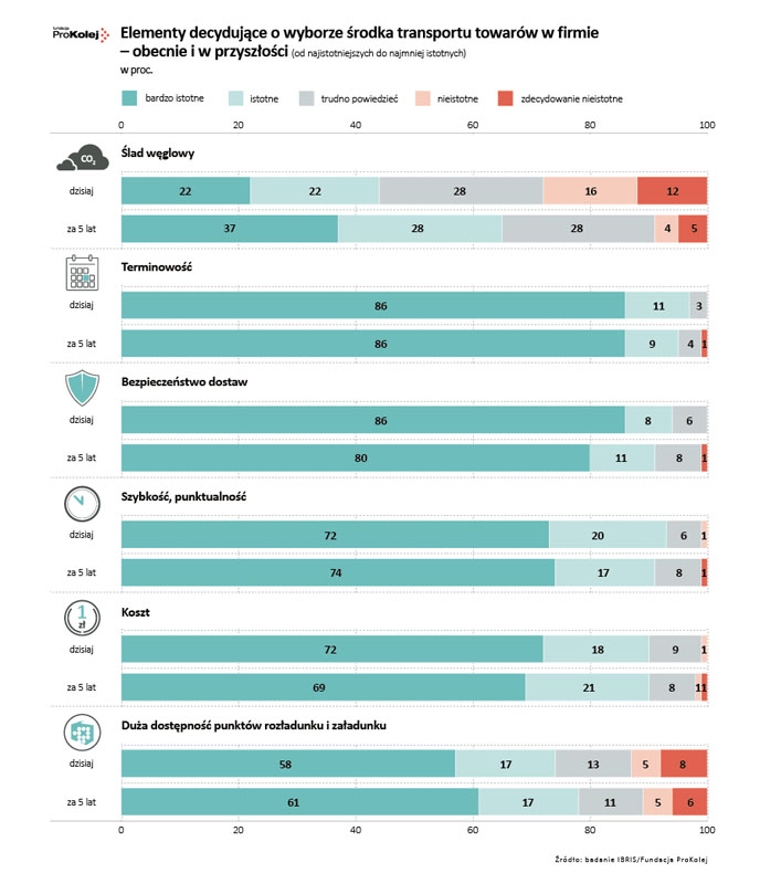 Badanie IBRIS wskazuje, że 29 proc. firm już dziś kieruje się kryterium śladu węglowego przy wyborze środka transportu towarów, i że równolegle ze wzrostem świadomości ekologicznej rola tego parametru rośnie. Zdaniem aż 65 proc. pytanych za pięć lat kryteria ekologiczne będą w przewozach zdecydowanie ważniejsze niż dziś.