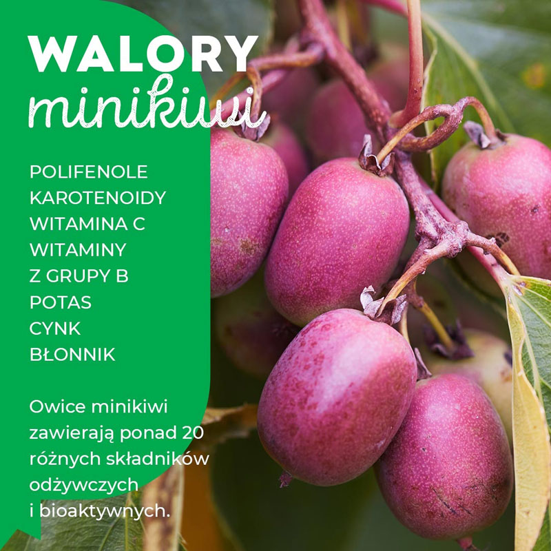 Udowodnione zostało działanie antyrakowe minikiwi. To jedno z najbogatszych źródeł witaminy C. Wśród popularnie spożywanych owoców to najbogatsze źródło luteiny, która silnie wspomaga nasz wzrok. Także najbogatsze źródło B8, niezbędnej do prawidłowego działania układu nerwowego.