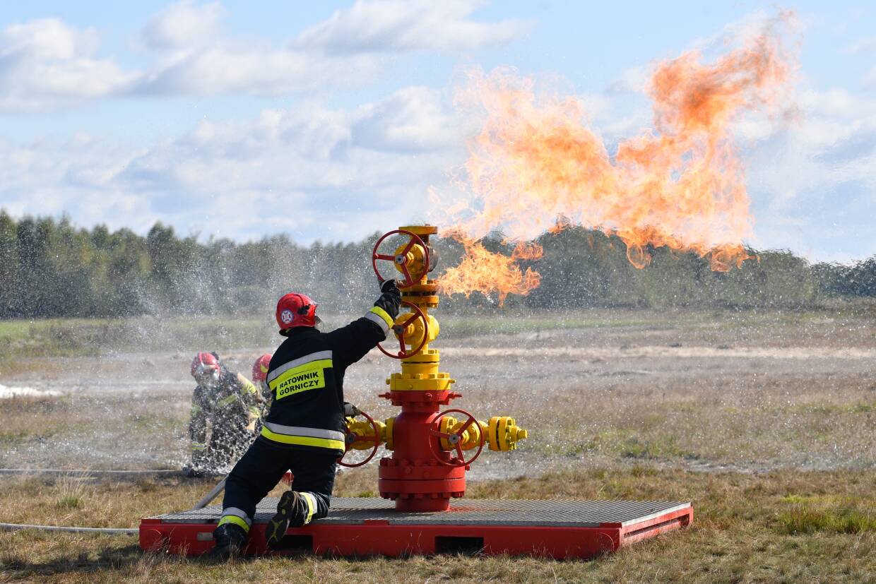 „Symulowaliśmy wypływ z uszkodzonej zasuwy gazu ziemnego. Wydobywający się gaz jest pod tak dużym ciśnieniem, że powoduje nagrzanie elementów głowicy eksploatacyjnej czy instalacji wydobywczych i dochodzi do samozapłonu gazu, co niejednokrotnie nie jest złą sytuacją, ponieważ pozwala ograniczyć atmosferę wybuchową i walczyć już tylko z ogniem” – wyjaśnił Marcin Rusek, z-ca dyrektora ds. ratownictwa, kierownik Jednostki Ratownictwa PGNiG S.A.