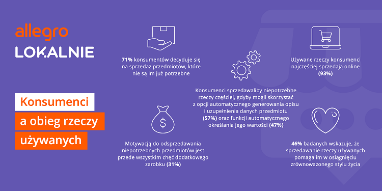 „Jako główne motywacje wymieniane są chęć dodatkowego zarobku, potrzeba zyskania przestrzeni w swoich domach, zamiar wykorzystania zarobionych środków na zakup innych potrzebnych przedmiotów oraz pragnienie, aby niepotrzebne już przedmioty zyskały drugie życie, zgodnie z ideą wspierania przyjaznego środowisku obiegu rzeczy używanych. Aż 93% osób wybiera sprzedaż online jako preferowany sposób pozbycia się swoich niepotrzebnych rzeczy, a prawie 57% respondentów korzysta w tym celu z platformy Allegro Lokalnie” – powiedziała Eliza Goździewicz, Allegro Lokalnie Business Unit Manager.