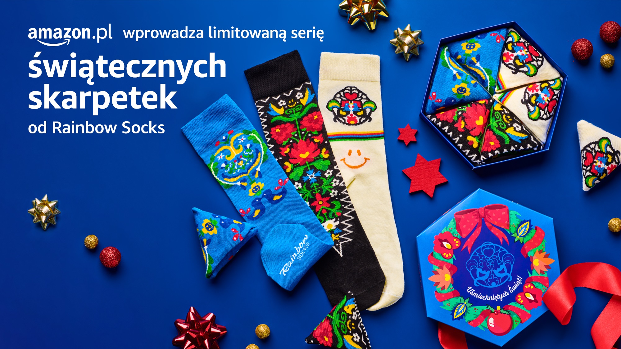 Amazon.pl wprowadza dziś do sprzedaży limitowaną serię produktów od polskiego producenta – zestaw skarpetek, stworzonych wspólnie z firmą Rainbow Socks. Limitowana seria produktów powstała specjalnie dla Amazon.pl i nawiązuje do tradycji z różnych regionów Polski, jest bowiem inspirowana lokalnymi wzorami – łowickim, góralskim i kaszubskim. Zestawy skarpetek dostępne są na Amazon.pl z szybką i darmową dostawą dzięki Amazon Prime, a cały dochód z ich sprzedaży zostanie przeznaczony na cele charytatywne.