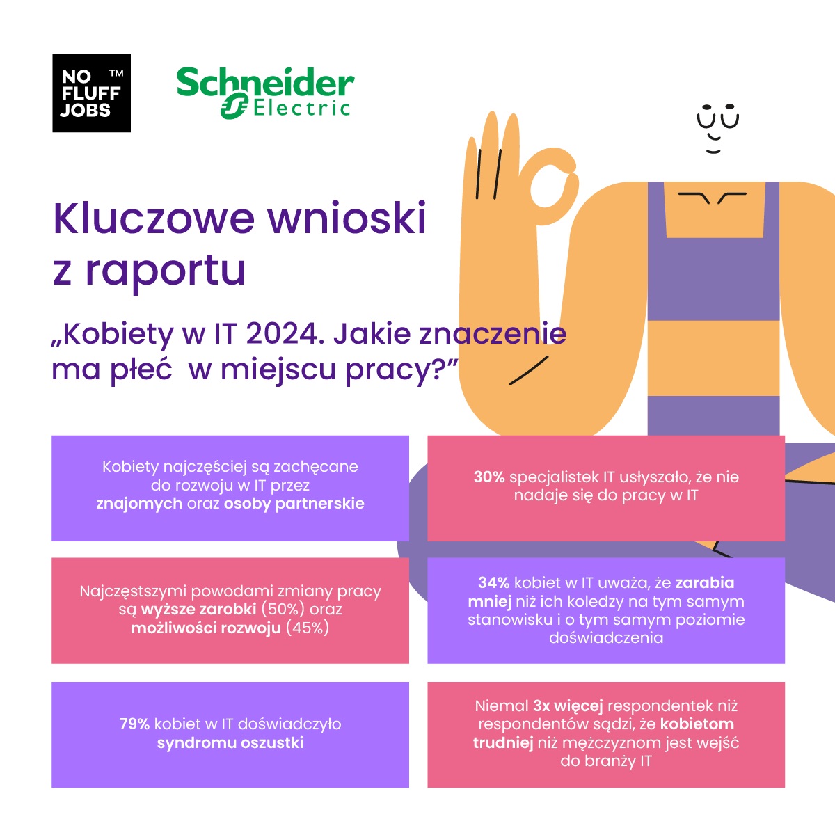 Aż 79 proc. specjalistek pracujących w branży IT przyznaje, że doświadczyło syndromu oszustki (zjawiska psychologicznego polegającego na braku wiary we własne kompetencje mimo zewnętrznych dowodów, które je potwierdzają), jak wynika z najnowszego raportu „Kobiety w IT”, przygotowanego jak co roku przez No Fluff Jobs, polski portal z ogłoszeniami o pracy, który od 10 lat wyznacza standardy rekrutacji. Wśród specjalistów IT syndromu oszusta doświadcza znacznie mniejszy, chociaż również duży odsetek - 62 proc. Partnerem raportu jest Schneider Electric.