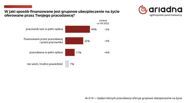 Niestety, rzeczywistość nie nadąża jeszcze za oczekiwaniami. Tylko 46% ankietowanych ma możliwość przystąpienia do grupowego ubezpieczenia na życie w swoim miejscu pracy. W przypadku 44% pokrycie kosztów takiego ubezpieczenia w całości spoczywa po stronie pracownika. W porównaniu do 2022 roku widać w tym temacie zmianę - coraz więcej pracodawców decyduje się na pełne finansowanie grupowego ubezpieczenia. Odsetek takich firm wzrósł o 6 punktów procentowych - to oznacza, że obecnie niemal co piąte przedsiębiorstwo (17%) oferuje pracownikom bezpłatne uczestnictwo w ubezpieczeniu grupowym.