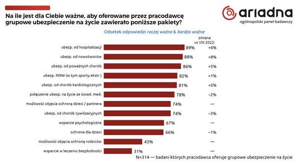 Co istotne, pracownicy nie tylko oczekują samych ubezpieczeń - równie ważna jest jakość ich zakresu. Dla 89% badanych kluczowe jest, aby grupowe ubezpieczenie na życie obejmowało ochronę na wypadek hospitalizacji, 88% wskazało na konieczność wsparcia w przypadku nowotworów, a 86% oczekuje zabezpieczenia na wypadek poważnych chorób.