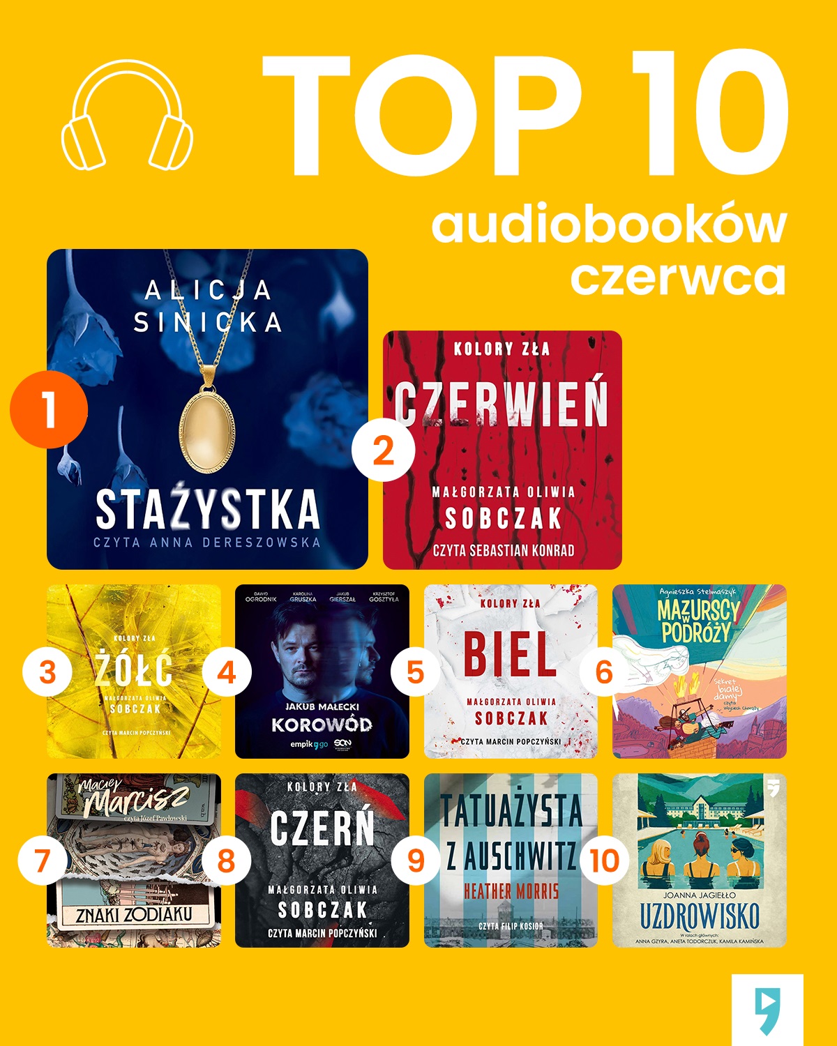 Użytkownicy Empik Go uwielbiają mroczne historie. Najczęściej słuchanym w czerwcu audiobookiem (https://www.empik.com/go) była „Stażystka” Alicji Sinickiej. Mroczna historia miłosnego trójkąta i potwornej zbrodni podbiła serca miłośników i miłośniczek thrillerów psychologicznych. Kolejne miejsca na podium zajęły dwa tytuły z serii „Kolory zła” autorstwa Małgorzaty Oliwii Sobczak. Zekranizowana przez Netflix, otwierająca serię - „Czerwień” przybliżyła słuchaczom postać prokuratora Leopolda Bilskiego (zagranego w filmie przez Jakuba Gierszała). Użytkownicy Empik Go chętnie słuchali również najnowszej części serii - „Żółci”, i to ona zamyka pierwszą trójkę.