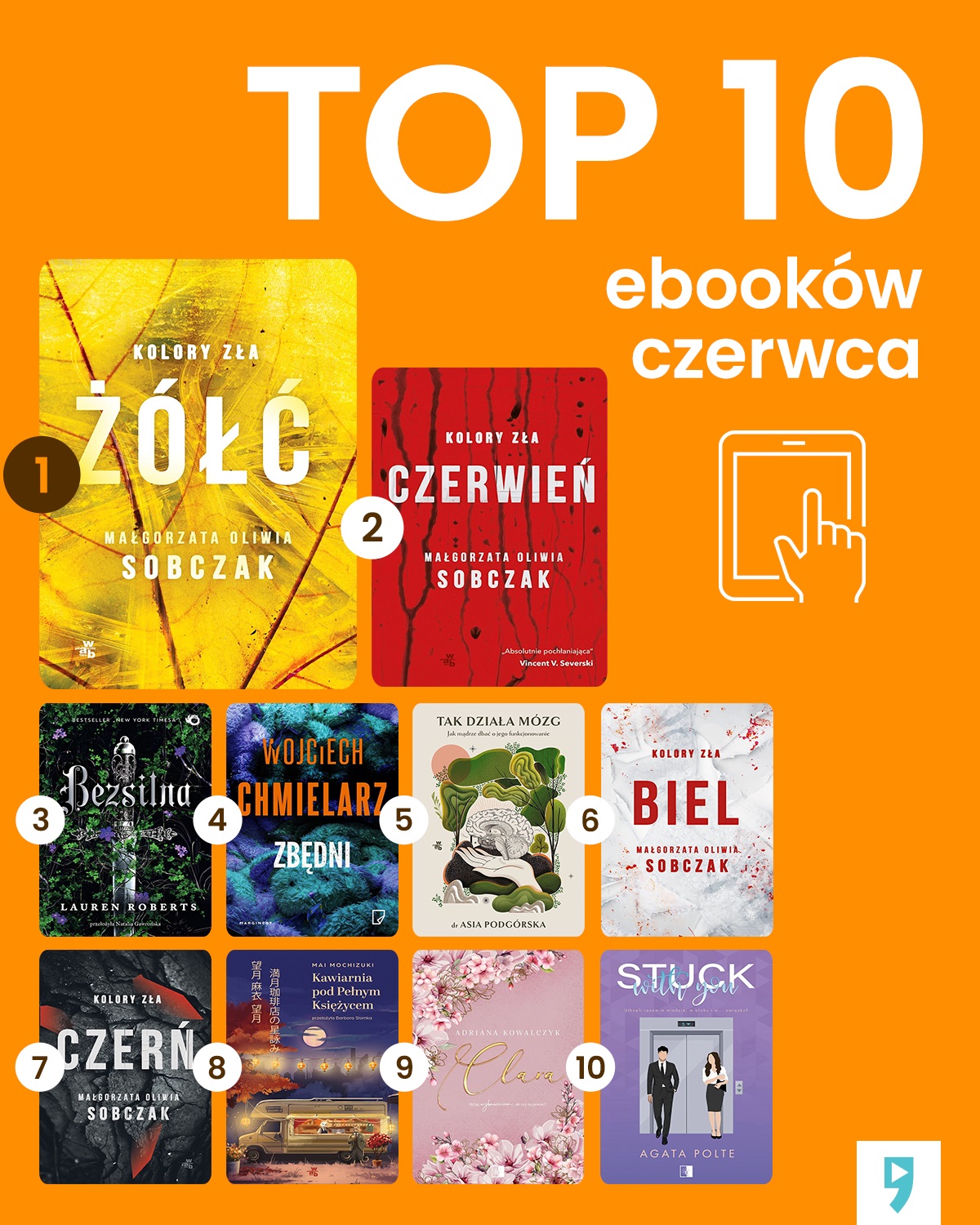 W sekcji ebooków (https://www.empik.com/go) również królowała Małgorzata Oliwia Sobczak. Czytelnicy ebooków także z ciekawością poznawali perypetie prokuratora Bilskiego. Inaczej niż w audiobookowym rankingu - pierwsze miejsce nalezało do „Żółci”, a drugie do „Czerwieni”. Numer 1. z poprzednich miesięcy - bestsellerowa powieść fantasy "Bezsilna" autorstwa Lauren Roberts, zajęła tym razem trzecie miejsce.
