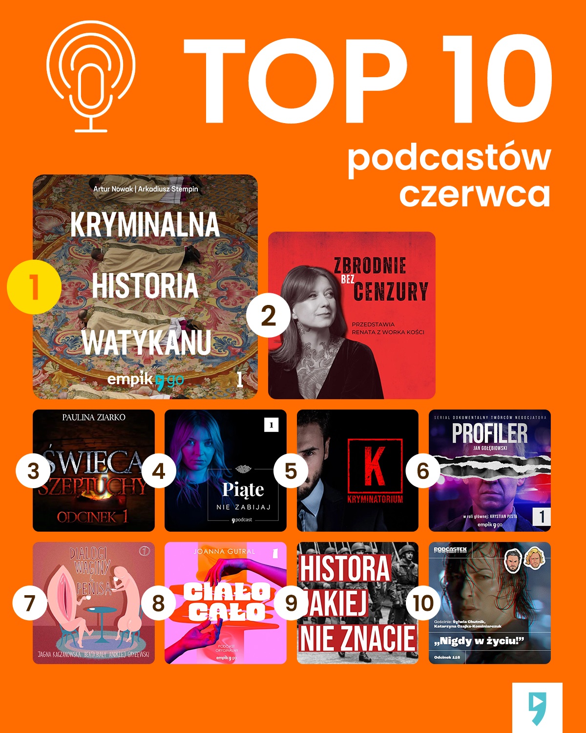 Najpopularniejszym podcastem (https://www.empik.com/go) w czerwcu 2024 roku była Kryminalna historia Watykanu. Arkadiusz Stempin i Artur Nowak zabierają nas do zepsutego świata intryg i korupcji. Na drugiej pozycji znalazł się truecrime'owy podcast „Renata z Worka Kości”. Historie prawdziwych zbrodni autorstwa Marcina Myszki i jego „Kryminatorium” uplasowały się w zeszłym miesiącu na miejscu trzecim.