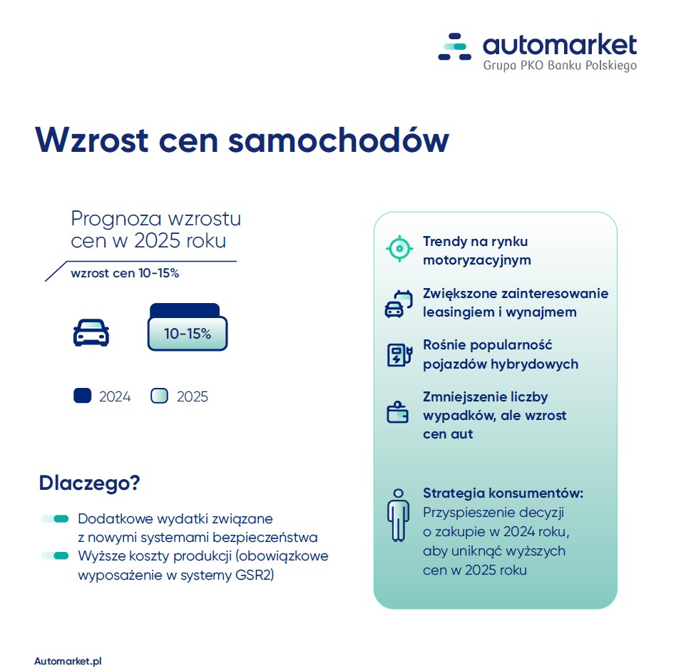 „Oczywiście nie wszyscy producenci podnieśli ceny od razu po 7 lipca. Większość robi to stopniowo. Wzrost cen już się zaczął i będzie kontynuowany w przyszłym roku. Szacujemy, że ceny niektórych samochodów mogą być większe w 2025 roku nawet o 10-15%. Część kierowców chce tego uniknąć i przyspiesza decyzje o zmianie samochodu - zamiast czekać do przyszłego roku, planują to zrobić jeszcze w 2024 roku. Widzimy to także po większym zainteresowaniu leasingiem i wynajmem na naszej platformie tej jesieni. Badania pokazują również, że 15% pytanych internautów zamierza kupić samochód w ciągu najbliższego roku” - mówi Tomasz Otto z platformy Automarket.pl.