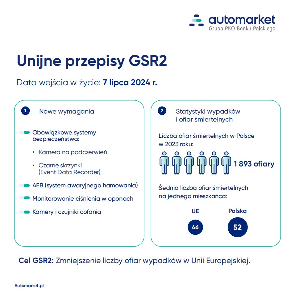 Unijne rozporządzenie General Safety Regulation (GSR2), które obowiązuje od 7 lipca 2024 roku, ma za zadanie podnieść poziom bezpieczeństwa kierujących pojazdami oraz pieszych i rowerzystów. Wcześniej, od 7 lipca 2022 roku, określone normy musiały spełniać wszystkie nowo homologowane w UE samochody. Z końcem okresu przejściowego w lipcu tego roku wymogi GSR2 muszą być spełniane przez każde nowe auto sprzedawane na terenie UE.