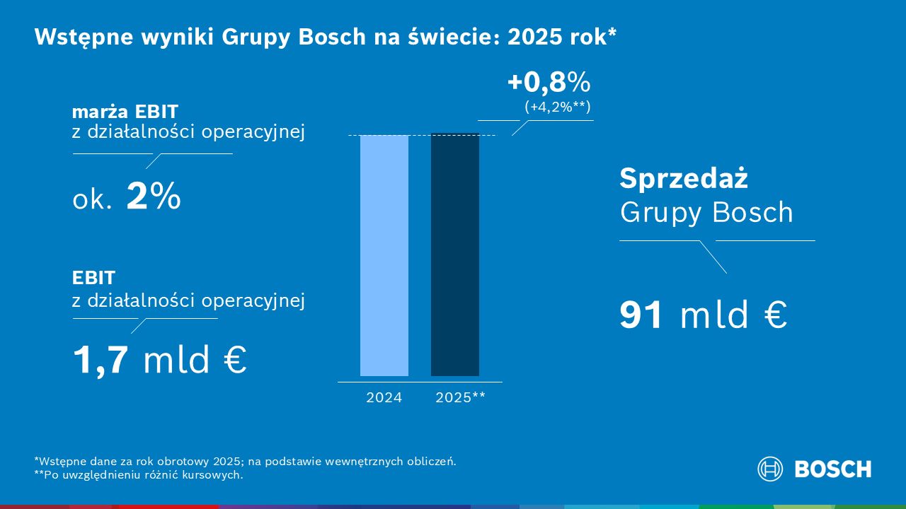 Firma Bosch podsumowała bardzo wymagający rok finansowy 2025. Według wstępnych danych[1] jej globalne obroty ze sprzedaży osiągnęły poziom 91 mld euro, co oznacza niewielki wzrost w porównaniu z rokiem poprzednim (2024: 90,3 mld euro). Po uwzględnieniu efektu kursów wymiany walut, sprzedaż na świecie wzrosła o 4,2 procent. Marża EBIT wyniosła ok. 2 procent, kształtując się poniżej oczekiwań (2024: 3,5 procent).