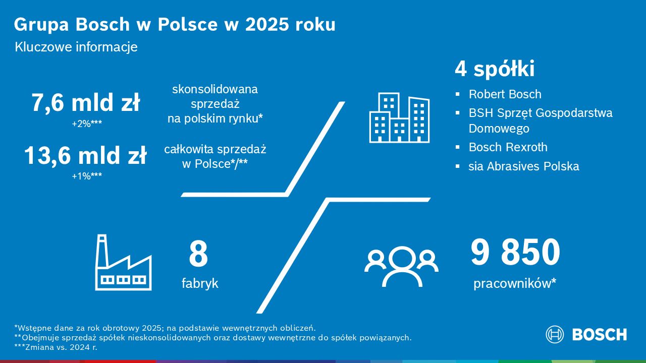 Według wstępnych danych, firma Bosch zakończyła rok 2025 z blisko 7,6 miliarda złotych[2] skonsolidowanej sprzedaży na rynku polskim, co oznacza wzrost o 2 procent w porównaniu z rokiem poprzednim. Łączna sprzedaż Grupy Bosch w Polsce, obejmująca sprzedaż spółek nieskonsolidowanych oraz dostawy wewnętrzne do spółek powiązanych wyniosła 13,6 miliarda złotych i wzrosła o 1 procent. Według wstępnych danych, na dzień 31 grudnia 2025 roku Grupa Bosch zatrudniała w Polsce 9 850 osób.