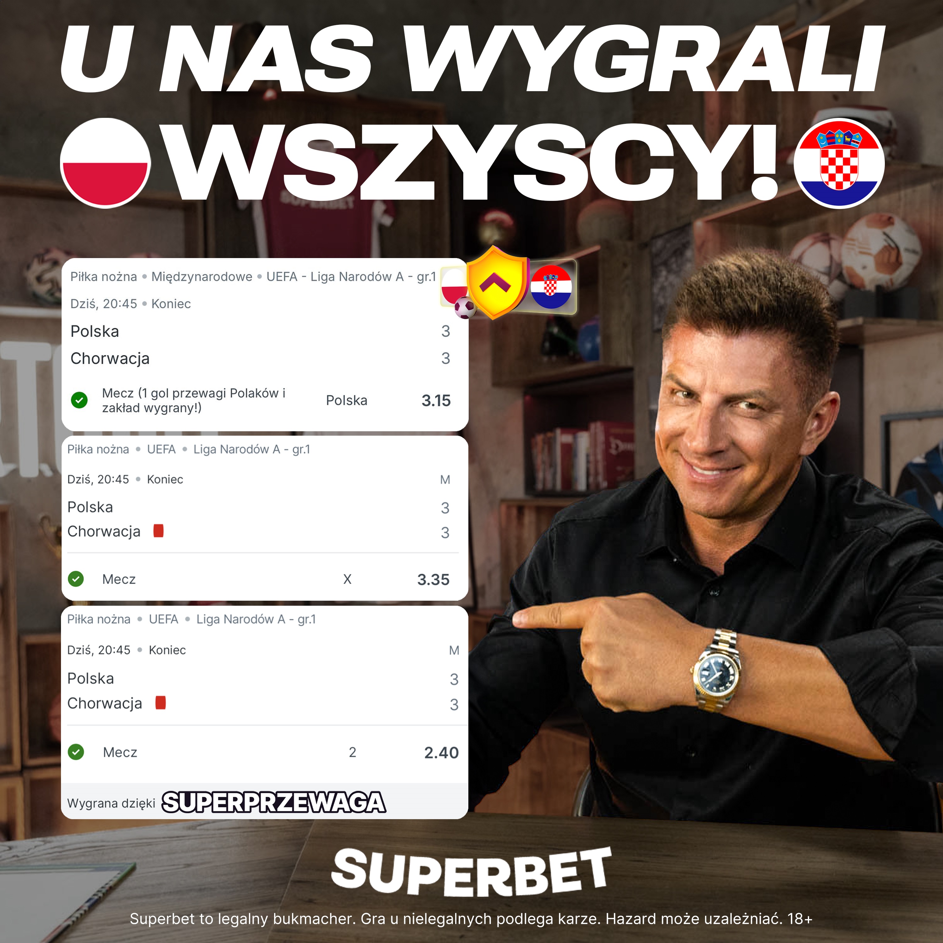 "Wtedy skończyło się porażką, teraz remisem z Chorwacją. Z kolei jeszcze za kadencji Fernando Santosa, drogo kosztowała nas Superprzewaga w meczu Polski z Mołdawią w Kiszyniowie, kiedy biało-czerwoni prowadzili do przerwy 2:0, żeby ostatecznie przegrać. Mówiąc z przymrużeniem oka, teraz idziemy w dobrym kierunku. Jako kibic biało-czerwonych mam nadzieję, że po kolejnych meczach będziemy rozliczać na zielono wyłącznie kupony zagrane na Polskę, bo nasza drużyna będzie wkręcała w murawę kolejnych rywali. Gdyby jednak miało być inaczej, to Superprzewaga, jak zawsze, będzie stała na straży kuponów" - kończy General Manager Superbet Polska.
