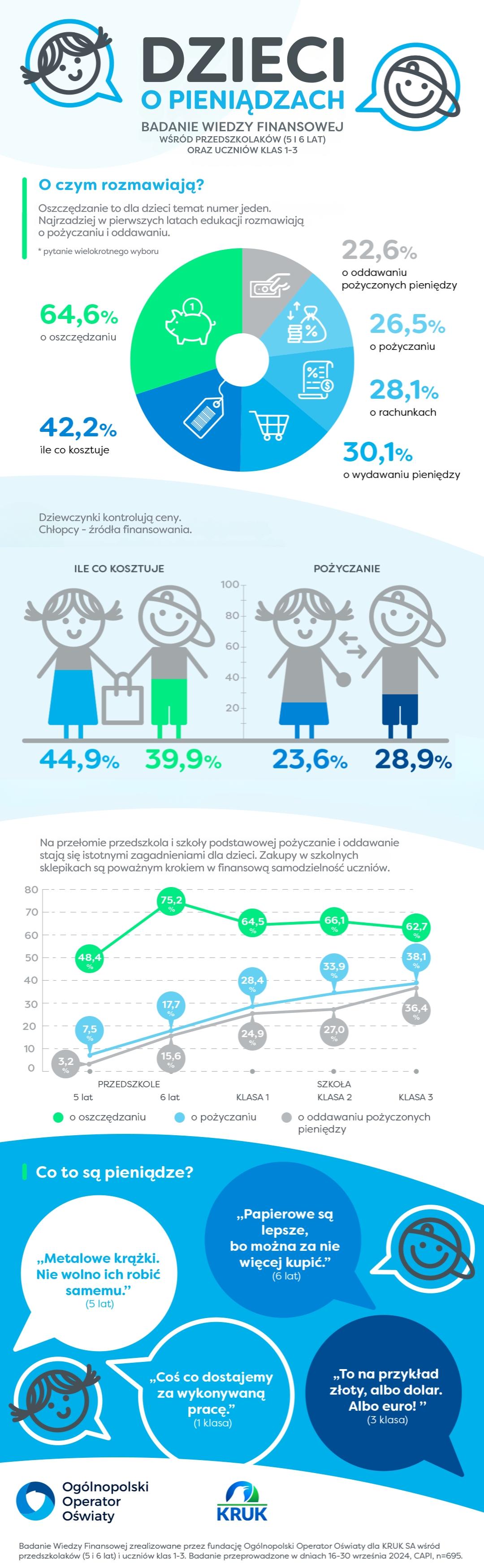 Badanie Wiedzy Finansowej przeprowadzone 16-30 września 2024 przez fundację Ogólnopolski Operator Oświaty dla KRUK S.A. wśród przedszkolaków (5 i 6 lat) i uczniów klas 1-3. CAPI, n=695. Jest częścią projektu Uczymy się OOO finansach, realizowanego z okazji Roku Edukacji Ekonomicznej w Polsce.