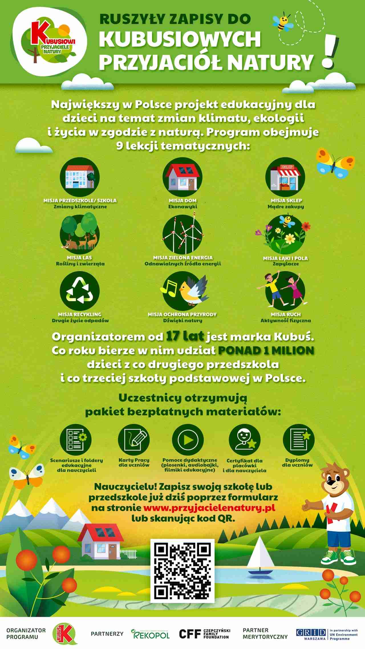 „Edukacja ekologiczna to kluczowy element budowania świadomości młodego pokolenia na temat ochrony środowiska i zrównoważonego rozwoju. Program >>Kubusiowi Przyjaciele Natury<< od lat skutecznie wprowadza najmłodszych w świat ekologii i odpowiedzialności za planetę. Akcja wyróżnia się kompleksowo opracowanymi i weryfikowanymi przez ekspertów materiałami, z których nauczyciele mogą korzystać podczas lekcji. Dzięki takim projektom dzieci nie tylko uczą się o znaczeniu recyklingu, ochrony przyrody czy zdrowego stylu życia, ale także wyrabiają nawyki, które będą procentować w dorosłym życiu” – komentuje Michał Purol, dyrektor ds. rozwoju UNEP/GRID-Warszawa.