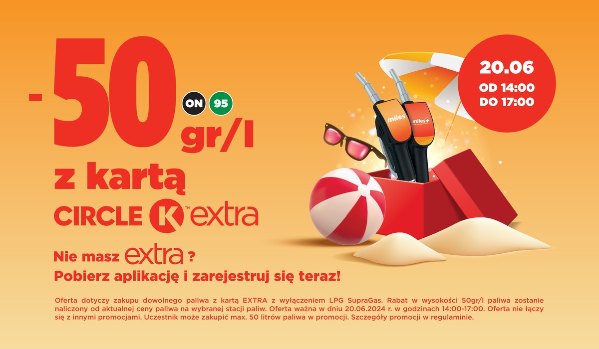 Sieć Circle K przygotowała wyjątkową ofertę, aby podziękować swoim klientom w całej Europie. Już w czwartek, 20 czerwca w godzinach 14:00-17:00, paliwa miles® oraz milesPLUS® będzie można zatankować z rabatem 50 gr/l, co pozwoli zaoszczędzić kierowcom nawet do 25 zł podczas jednego tankowania. Jedynym warunkiem, aby skorzystać z oferty, jest posiadanie karty lojalnościowej Circle K EXTRA.