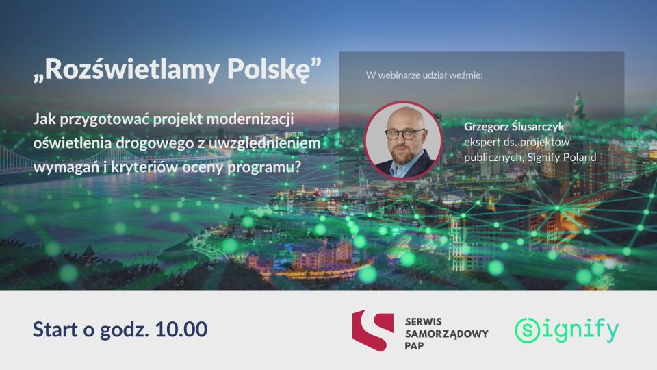 „Chciałbym zaznaczyć, że projektu oświetleniowego w Polsce w takiej skali jeszcze nie mieliśmy. To pierwszy raz, kiedy polski rząd przeznacza miliard zł na modernizację nieefektywnych opraw oświetlenia ulicznego” – powiedział Grzegorz Ślusarczyk, ekspert ds. projektów publicznych w Signify Poland (poprzednio Philips Lighting) podczas webinaru transmitowanego w Serwisie Samorządowym PAP.