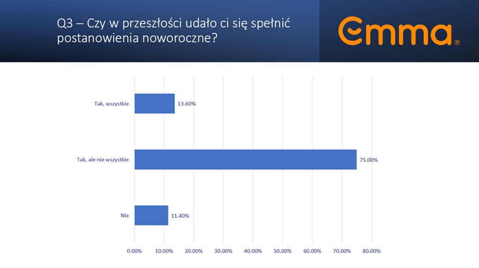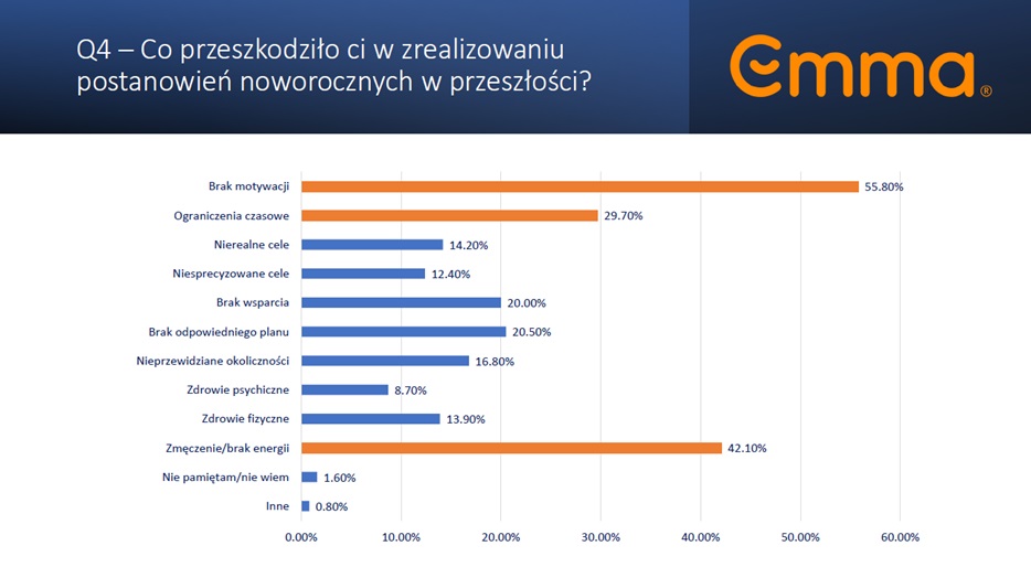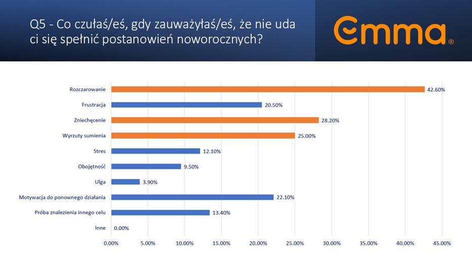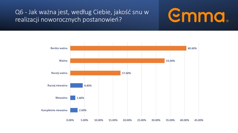 Według badań przeprowadzonych przez Emma Sleep, wspólnie z firmą Appinio, potwierdzono, że wielu Polaków nie realizuje wszystkich swoich postanowień noworocznych - głównie z powodu braku motywacji (55,8%) oraz zmęczenia i braku energii (42,1%). Wspomniane niepowodzenia skutkują podwyższonym poziomem rozczarowania (42,6% respondentów) i frustracji (20,5%). Z kolei aż 91% respondentów uważa jakość snu za istotną w osiąganiu swoich celów.