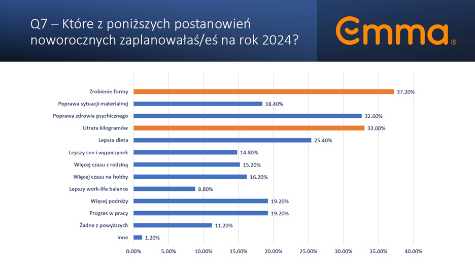 • Dominujące postanowienia wśród Polaków to: poprawa formy (37,2%), utrata kilogramów (33%), poprawa zdrowia psychicznego (32,6%), czy też lepszy sen i wypoczynek (14,8%).