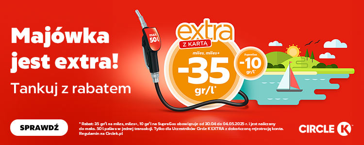 Z okazji majówki, sieć Circle K przygotowała dla swoich klientów wyjątkową ofertę rabatową, umożliwiającą konkretne oszczędności na kosztach wiosennych podroży. Od 30 kwietnia do 4 maja, kierowcy odwiedzający stacje sieci będą mogli skorzystać z rabatów na paliwa miles® oraz miles+® w wysokości 35 gr/l, a także na SupraGas (LPG) - 10 gr/l. Z oferty można korzystać wielokrotnie, a jedynym warunkiem jest bycie zarejestrowanym w programie Circle K EXTRA. Tankując 50 litrów, można zaoszczędzić nawet 17,50 zł na jednej transakcji, co w przypadku kilku tankowań podczas majówki, może nam przynieść łącznie nawet kilkadziesiąt złotych oszczędności na paliwie.
