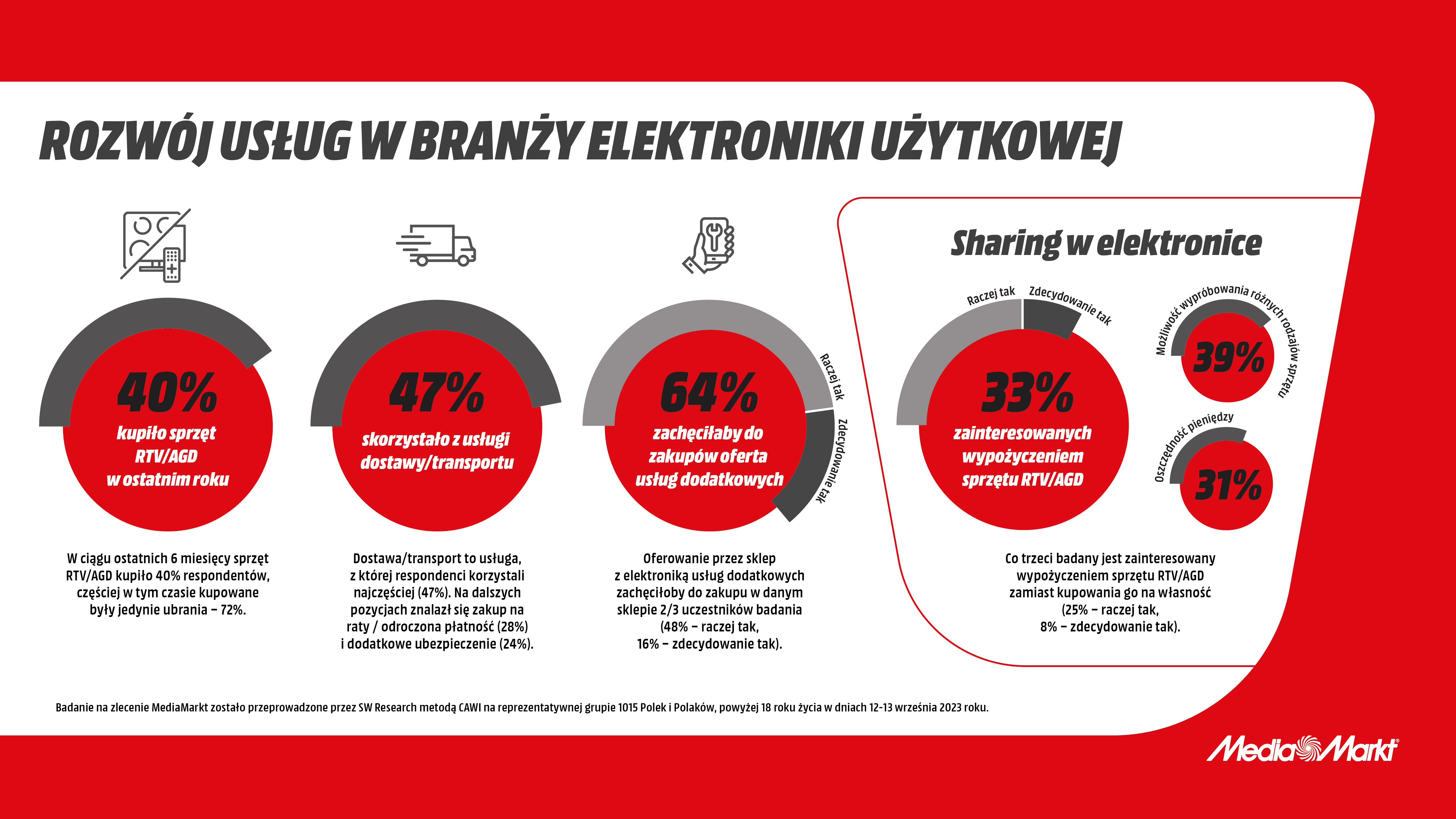 Jednym z najważniejszych trendów, za którym podąża sieć, jest sukcesywne rozwijanie oferty usług. Dla współczesnego klienta sam produkt, nawet wyjątkowo wyspecjalizowany i w dobrej cenie, to obecnie zdecydowanie za mało. Coraz częściej liczy się pozytywne doświadczenie związane z zakupami, na które składają się wartości reprezentowane przez daną markę, ale i szeroki wybór usług wspierających klienta w całej ścieżce zakupowej oraz efektywnym użytkowaniu produktu. Potwierdza to najnowsze badanie wykonane we wrześniu 2023 roku na zlecenie MediaMarkt przez agencję SW Research, pt. „Rozwój usług w branży elektroniki użytkowej”.[1] 2/3 ankietowanych badania deklaruje, że do zakupów elektroniki w danej sieci zachęca ich dostępność dodatkowych usług. Najczęściej wskazywane są dostawa i transport RTV i AGD - z tej możliwości korzystało aż 47% respondentów. Na drugim miejscu plasują się popularne w ostatnich latach zakupy na raty lub odroczone płatności (28%), a nieco mniejszy odsetek respondentów deklaruje, że korzystał z dodatkowego ubezpieczenia sprzętu (24%). Wyniki te potwierdzają, że sam dobry sprzęt już nie wystarczy dzisiejszym konsumentom.